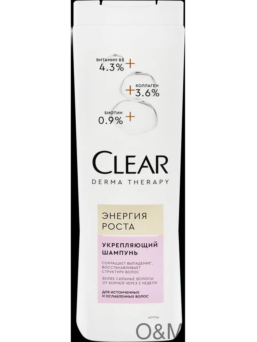 Шампунь для волос СLEAR Derma therapy Энергия роста, укрепляющий – это система ухода для восстановления баланса кожи головы и силы волос от корней до кончиков. Формула шампуня с коллагеном и биотином укрепляет волосы по всей длине. Витамин В3 сокращает выпадение, восстанавливая структуру волос. В результате более сильные волосы от корней.