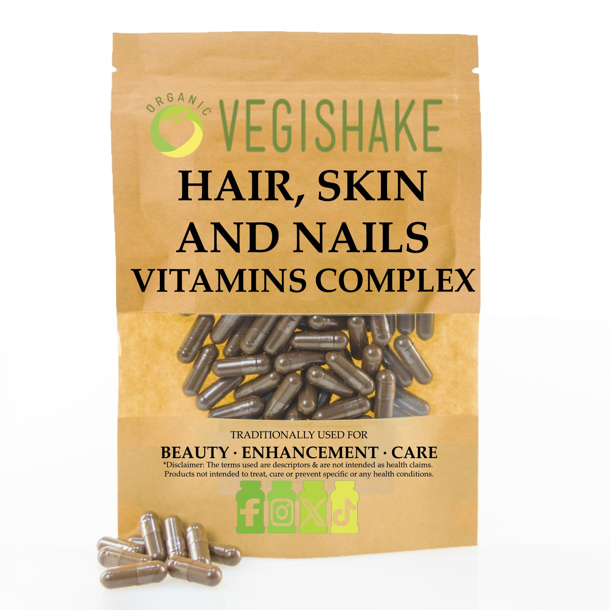 Vegishake Hair Skin and Nails Vitamins - Enhanced with Biotin, Niacin, Vitamin C, and Bamboo Shoot Extract What's in your pack: - Hair, Skin, and Nails Capsules (2 capsules per serving) - 2 Capsules Contains: Organic Bamboo 10:1 Extract: (3,333.34mg equivalent) Vitamin C: 333.34mg (417% NRV*) Niacin (Vitamin B3): 333.34mg (2,083% NRV*) HPMC capsules (Hypromellose) Biotin (Vitamin B7): 10,000µg (20,000% NRV*) *NRV = Nutrient Reference Value. with No Fillers – No Binders – No Nasty Extras - Vegan, Vegetarian, Gluten-Free, Cruelty-Free - Made in the UK Why Use Vegishake’s Hair, Skin, and Nails Support Capsules? Includes essential nutrients like biotin, niacin, and plant-based silica from bamboo shoot extract. Perfectly crafted for individuals seeking natural and clean supplementation. Supports your wellness goals with a plant-based and eco-friendly approach. Convenient and easy-to-take capsules, designed for daily use. Proudly made in the UK using sustainable and ethical practices. These beauty vitamins are the perfect addition to your daily routine! Add to Cart, Subscribe, and become part of the Vegishake family today. INGREDIENTS Microcrystalline Cellulose, Zinc Citrate Dyhidrate, D-Biotin, Magnesium stearate, Sodium selenite DIRECTIONS Take 2 tablets daily with a full glass of water. SAFETY WARNING Food supplements should not be used as a substitute for a varied balanced diet. Do not exceed the stated dose. Keep out of the reach of children. Not intended for use by persons under the age of 18. Side effects from this supplement are rare. Please discontinue use and contact your GP immediately in the event of an adverse reaction. If pregnant, breast feeding or on medication, please consult a healthcare professional before use. Allergen warning: For allergens see ingredients in bold. Produced in a facility that handles dairy See more WHY BUY OUR HAIR SKIN AND NAILS VITAMINS? Each pouch contains 180 capsules crafted with a powerful blend of Biotin (10,000µg), Organic Bamboo Extract (10:1), Vitamin C, and Niacin, formulated to support your beauty goals. Biotin is often associated with maintaining luscious hair, radiant skin, and strong nails. The Organic Bamboo Extract provides a high silica content, widely recognized for its structural benefits. Vitamin C and Niacin contribute to skin vitality and energy metabolism. These premium-quality vitamins are perfect for men and women, manufactured right here in the UK.
