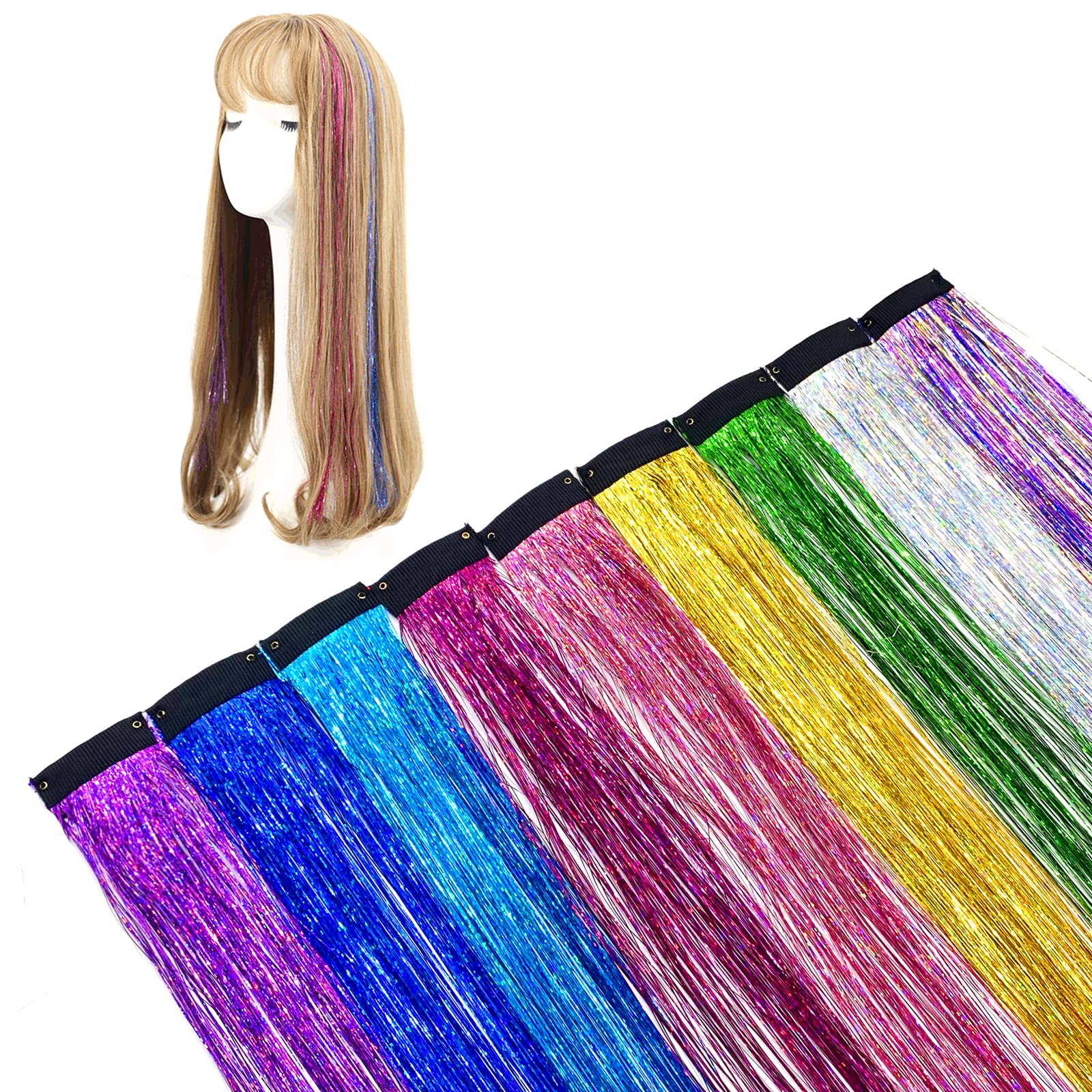 Widely Used Glitter Hair extensions: The hair tinsel is very shiny and fashion, suitable for Christmas, New Year, Halloween, cosplay, birthday party, hair beauty. The hair glitter strands will add amazing colour and sparkle to your hair, make you charming in the crowd. Easy to Use Fairy Hair: Each girls hair extension is equipped with a small clip, can be easily clipped into your hair, you can have a glamorous hairstyle in seconds.Each glitter hair tinsel strand is individually packaged, easy to store. Size: 19.69 inch/50cm. Quality Glitter Hair Tinsel: Beautiful and shiny hair tinsel is made of shiny PET material silk thread with PP clip, silky, soft and light. No Tangles and No Shedding.Tinsel hair extensions clip in are amazing without any hurt or chemical treatment to your hair. DIY Multiple Hair Extensions: The 9 colors pretty hair tinsel extensions support different hairstyles. You can clip one color to your hair directly or match different sparkling hair extensions together. With our fashionable hair dazzle strands you will be the most charming and eye-catching girl in the crowd. What You Get: You will receive 9PCS hair tinsel in a green, royal blue, sky blue, rose red, light purple, pink, yellow, silver and colored. The hair tinsel clip in come in various colors can easy to match your style, also can meet your fashion pursuit, highlight your elegant and confidence.