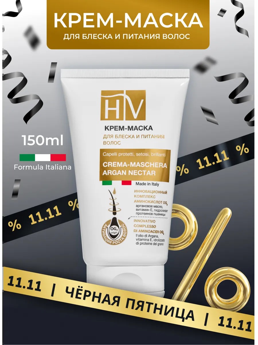 HV Маска для волос Hair Vital Аргановый нектар разработана специально для сухих, окрашенных и поврежденных волос, лишенных блеска и жизненной силы. Активные компоненты крем-маски питают сухие и ломкие волосы полезными микроэлементами, сглаживают кератиновые чешуйки и способствует восстановлению поврежденных участков волос глубоко изнутри. Восстанавливающая маска для окрашенных и сухих волос разработана на основе комплекса аминокислот OG2 и масла ши (карите) - это уникальная рецептура итальянских ученых лаборатории Betafarma S.p.A. . Инновационная формула OG2 стимулирует выработку кератина, утолщает и укрепляет волос, предотвращая ломкость и появление сеченых концов. Увлажняющая маска с маслом ши восстанавливает структуру обезвоженных волос, придает им эластичность, живой блеск и гладкость. Крем для волос глубоко питает луковицы и защищает кожу головы от сухости, шелушения и перхоти. При постоянном использовании пряди прекращают расслаиваться и сечься на концах. Волосы после маски Нair vital становятся мягкими, блестящими и эластичными, значительно облегчается расчесывание и укладка. Средство не содержит парабены. Способ применения: Нанести достаточное количество маски на чистые влажные волосы и с помощью расчески распределить по всей длине волос. Через 3-5 минут тщательно смыть водой. Идеальный подарок на 8 марта !