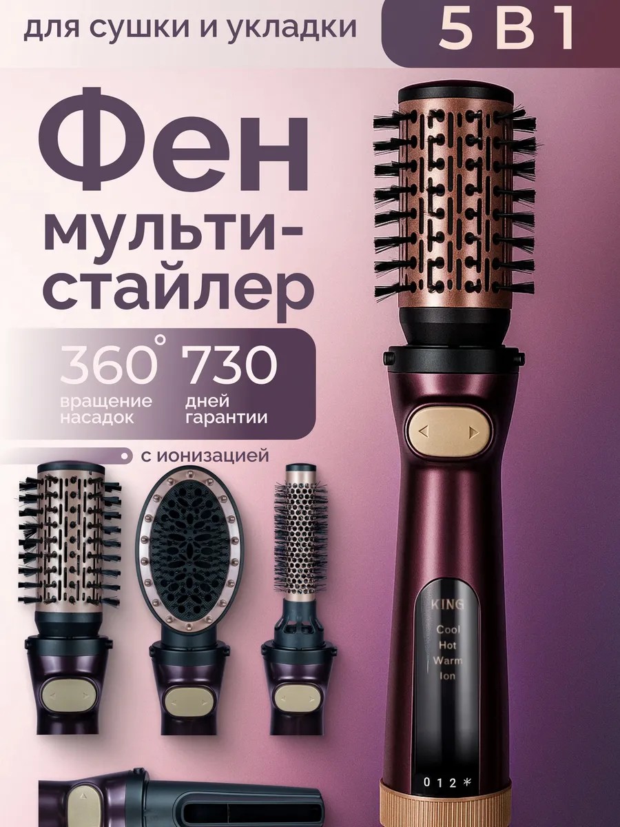 The 5-in-1 hair dryer brush is a professional hair dryer brush with a display that can be used simultaneously as a hair dryer, straightener, styler, brush, or curling iron. This multi-styler features three temperature settings: cool, medium, and hot. During curling, the dryer provides ionization, ensuring safe and healthy care for hair of any length and thickness. The device is equipped with a rotating cord and a hanging loop for convenient storage. The manufacturer provides a 2-year warranty on the KING professional hair styler. This hair brush is an excellent replacement for a traditional curling iron. The hair dryer brush gently dries and smoothes curly or slightly frizzy hair. The temperature of the airflow prevents damage to hair follicles or excessive drying of the scalp. The styling comb allows you to create hairstyles of any complexity for adults or children. The hairbrush is easy to clean and requires no special care. The 5-in-1 hair dryer brush includes five interchangeable attachments to suit any hair length or style: large, medium, and fine brushes, a round curling attachment, and a hairbrush attachment. The 2-meter cord is perfect for home and travel use. We recommend this hair dryer styler as a gift for your mom or friend for her birthday, February 14th, or March 8th.