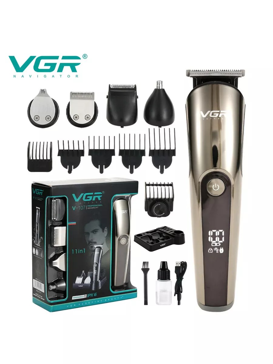 Многофункциональный набор VGR V-107 включает в себя профессиональную машинку для стрижки волос с четырьмя насадками (от 3 до 12 мм), триммер с узкими ножами для художественного бритья, триммер для ушей и носа. В комплекте имеется насадка, которая позволяет использовать этот триммер как бритву, которая легко справляется с любым типом волос. Триммер работает на аккумуляторе до 2,5 часов. Работает с очень низким уровнем шума. С помощью такого триммера, имеющего функции многофункционального устройства по уходу за волосами, можно постричь волосы, сделать окантовку, придать форму бороде, а также удалять волосы из труднодоступных мест (носа и ушей).