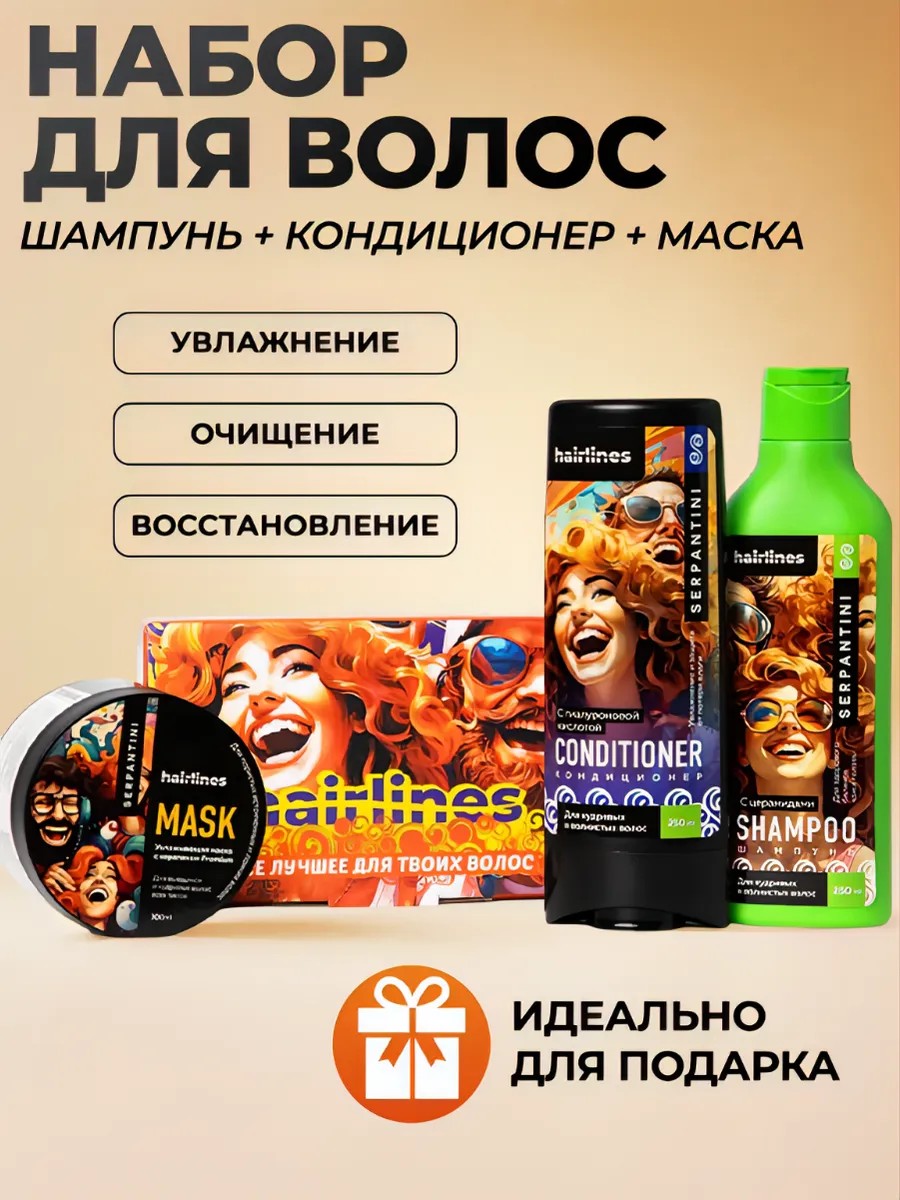 Набор для ухода за волосами SERPANTINY в подарочной коробке включает шампунь, кондиционер и маску с кератином. Эти три продукта ХЭЙРЛАЙНС подарят вашим волосам блеск и силу, идеально подходят для профессионального ухода в домашних условиях. Это замечательный подарок на 8 марта, день рождения и другие праздники.