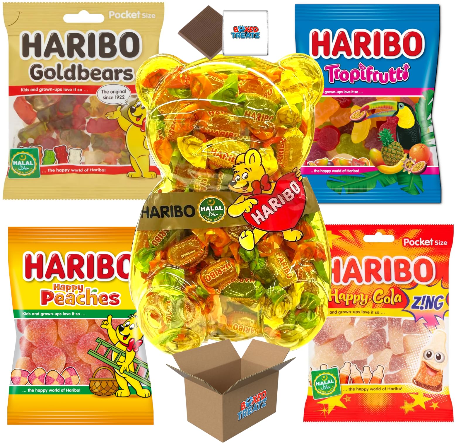HALAL Sweets Bundle featuring an assortment of delightful treats. This bundle includes four classic Haribo varieties: Peaches, Tropifrutti, Goldbears, and Happy Cola Zing, each weighing 100g, for a total of 400g. These treats are certified HALAL, ensuring they meet strict dietary requirements. **Key Features:** - **HALAL Certified:** Rest assured, these Haribo treats are HALAL certified, meeting dietary standards. - **Assorted Flavors:** Enjoy a variety of flavors with Peaches, Tropifrutti, Goldbears, and Happy Cola Zing, offering a diverse taste experience. - **Convenient Bundle:** The bundle includes 100g packs of each flavor, providing a convenient way to sample a range of Haribo treats. **Variants:** 1. **HALAL Haribo Bundle: Peaches + Tropifrutti + Goldbears + Happy Cola Zing 100g each (400g):** This variant includes individual packs of Peaches, Tropifrutti, Goldbears, and Happy Cola Zing, each weighing 100g, for a total of 400g. 2. **HALAL Haribo Bundle with Haribo Halal Soft Jelly Bear Case 1Kg:** In addition to the 400g bundle, this variant includes a 1Kg case of Haribo Halal Soft Jelly Bears, providing even more delicious treats to enjoy. 3. **Haribo Halal Soft Jelly Bear Case 1Kg:** This variant features a 1Kg case of Haribo Halal Soft Jelly Bears, perfect for those who crave a larger quantity of this classic treat. **Additional Products:** - **Haribo Halal Happy Peaches 100g:** Indulge in the fruity flavor of Haribo Halal Happy Peaches, offering a delicious fruit-flavored gum experience. - **Haribo Halal Gold Bears 100g:** Enjoy the iconic taste of Haribo Halal Gold Bears, featuring flavors like pineapple, raspberry, orange, apple, lemon, and strawberry. - **Haribo Halal Happy Cola Zing 100g:** Savor the fizzy cola flavor with Haribo Halal Happy Cola Zing, offering a delightful gum experience. - **Haribo Halal Tropifrutti 100g:** Experience the tropical flavors of Haribo Halal Tropifrutti, providing a fruity gum experience reminiscent of a tropical paradise. - **Haribo Halal Soft Jelly Bear Case 1Kg:** This giant bear plastic gift case contains 1Kg of Haribo Halal Soft Jelly Bears, making it a perfect gift or indulgence for any occasion. Enjoy the delicious flavors and HALAL certification of these Haribo treats, perfect for satisfying your sweet cravings! INGREDIENTS Sugar, Glucose Syrup, Gelling Agent: Pectin, Humectant: Sorbitol, Acid: Citric Acid, Acidity Regulator: Trisodium Citrate, Fruit Juice Concentrates: Lemon, Orange, Strawberry, Apple, Fruit and Plant Concentrates: Black Carrot, Spirulina, Safflower, Radish, Apple, Flavouring, Invert Sugar Syrup, This product does not contain any Pig Gelatine or any other Pig based ingredients Sugar, Glucose Syrup, Beef Gelatine (Halal), Acid: Citric Acid, Fruit and Plant Concentrates: Safflower, Spirulina, Apple, Carrot, Blueberry, Elderberry, Blackcurrant, Orange, Kiwi, Lemon, Aronia, Mango, Passion Fruit, Grape, Flavouring, Elderberry Extract, Glazing Agents: White and Yellow Beeswax, Carnauba Wax, Caramelised Sugar Syrup, Invert Sugar Syrup Glucose Syrup, Sugar, Beef Gelatine (Halal), Dextrose, Acids: Citric Acid, Malic Acid, Acidity Regulators: Calcium Citrate, Sodium Malates, Caramelised Sugar Syrup, Flavouring, Glazing Agent: Carnauba Wax Glucose Syrup, Sugar, Beef Gelatine (Halal), Dextrose, Fruit Juice from Concentrate: Apple, Strawberry, Raspberry, Orange, Lemon, Pineapple, Acid: Citric Acid, Fruit and Plant Concentrates: Safflower, Spirulina, Apple, Elderberry, Orange, Blackcurrant, Kiwi, Lemon, Aronia, Mango, Passion Fruit, Grape, Flavouring, Elderberry Extract, Glazing Agents: Beeswax, Carnauba Wax Sugar, Glucose Syrup, Beef Gelatin (Halal), Acids: Citric Acid, Fumaric Acid, Fruit and Plant Concentrates: Safflower, Elderberry, Blackcurrant, Orange, Lemon, Mango, Passion Fruit, Aronia, Grape, Elderberry Extract, FlavouringIncludes: 1x Variant Of Your Choice + 1X Boxed Treatz Jelly Bean, Mint Or Neapolitan Chocolate (1 Piece). Sweets Halal Tropifrutti 100g: Experience the tropical flavors of Sweets Halal Tropifrutti, providing a fruity gum experience reminiscent of a tropical paradise. Sweets Halal Soft Jelly Bear Case 1Kg: This giant bear plastic gift case contains 1Kg of Sweets Halal Soft Jelly Bears, making it a perfect gift or indulgence for any occasion. Additonal Info: Sweets Halal Happy Peaches 100g: Indulge in the fruity flavor of Sweets Halal Happy Peaches, offering a delicious fruit-flavored gum experience. Sweets Halal Gold Bears 100g: Enjoy the iconic taste of Sweets Halal Gold Bears, featuring flavors like pineapple, raspberry, orange, apple, lemon, and strawberry. Sweets Halal Happy Cola Zing 100g: Savor the fizzy cola flavor with Sweets Halal Happy Cola Zing, offering a delightful gum experience. Sweets Halal Soft Jelly Bear Case 1Kg: This variant features a 1Kg case of Sweets Halal Soft Jelly Bears, perfect for those who crave a larger quantity of this classic treat. HALAL Sweets Bundle with Sweets Halal Soft Jelly Bear Case 1Kg: In addition to the 400g bundle, this variant includes a 1Kg case of Sweets Halal Soft Jelly Bears, providing even more delicious treats to enjoy. HALAL Sweets Bundle: Peaches + Tropifrutti + Goldbears + Happy Cola Zing 100g each (400g): This variant includes individual packs of Peaches, Tropifrutti, Goldbears, and Happy Cola Zing, each weighing 100g, for a total of 400g. Convenient Bundle: The bundle includes 100g packs of each flavor, providing a convenient way to sample a range of Sweets treats. Assorted Flavors: Enjoy a variety of flavors with Peaches, Tropifrutti, Goldbears, and Happy Cola Zing, offering a diverse taste experience. HALAL Certified: Rest assured, these Sweets treats are HALAL certified, meeting dietary standards. HALAL Sweets Bundle: Peaches 100g,Tropifrutti 100g, Goldbears 100g , Happy Cola Zing 100g, Sweets Halal Soft Jelly Bear Gift Case 1Kg, Boxed Treatz.