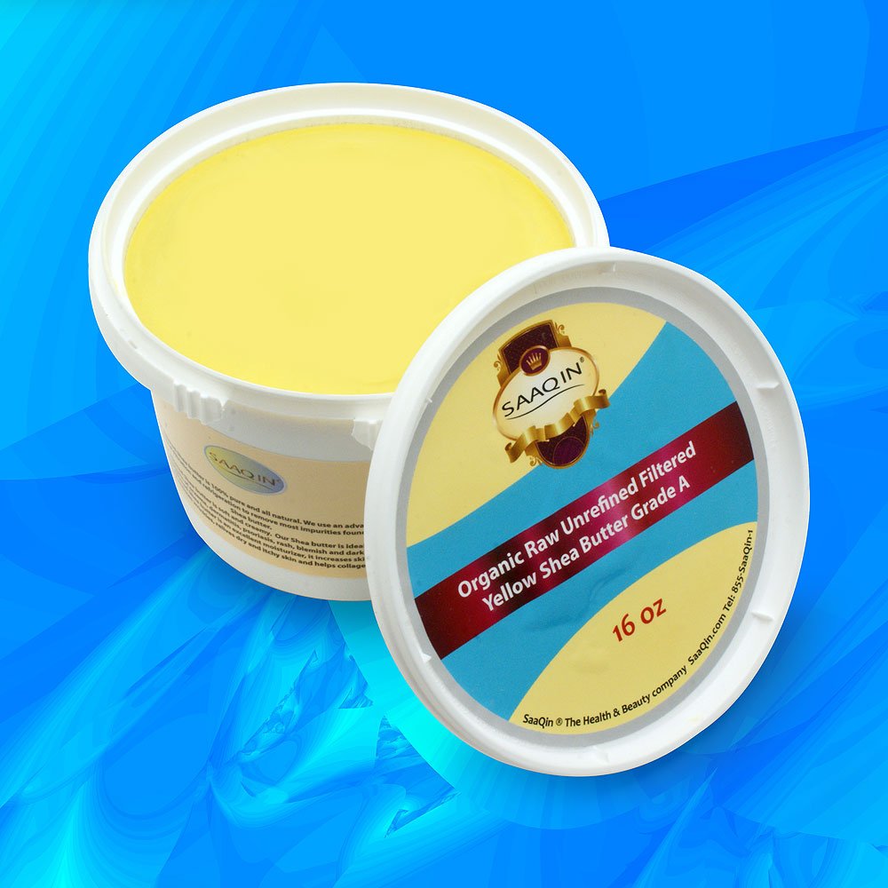 SAAQIN Registered Trademark and the only to sell Filtered and creamy Shea butter. Comes with recipe on how to use it and make organic body butters. This Shea Butter is 100 Free of impurities, Bacteria Free and uniform yellow. Comes in a Temper proof jars protected from light which is known to alter the quality of Shea butter. Organic Unrefined Shea Butter very creamy, clean and Soft to the highest Quality. Gross weight 48oz .