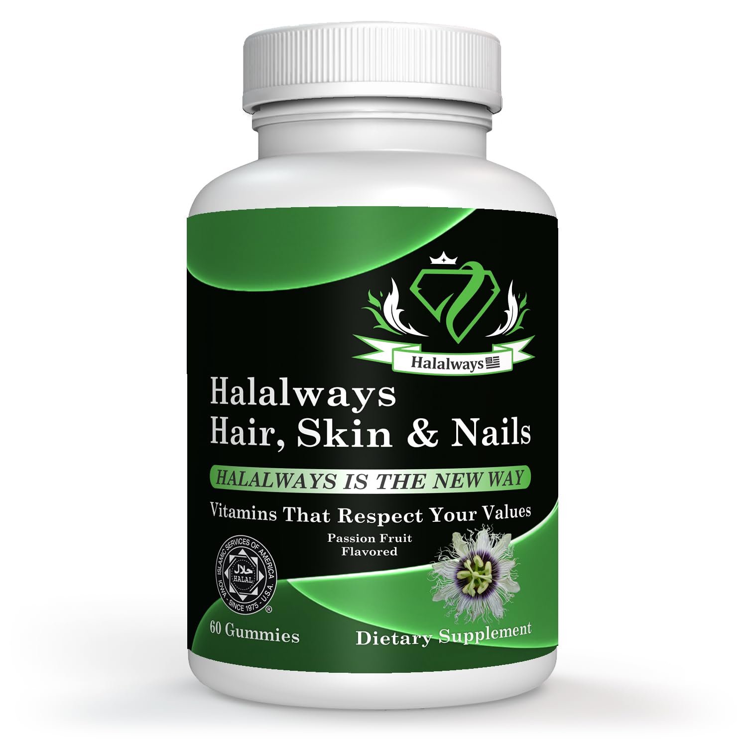 Halalways Hair, Skin Nails Gummy Certified Halal Supplement is a natural supplement that provides you with a delightful passion fruit flavor. With this supplement, you can expect to experience significant health benefits for your hair, skin and nails. Biotin 6000 mcg: This supplement is packed with Biotin which promotes healthy hair growth. It also supports healthy skin and nails. Folate: Halalways Hair, Skin Nails Gummy Certified Halal Supplement contains Folate which helps support overall health. Natural Supplements: The ingredients used in this product are natural supplements that will help keep your body looking and feeling great! This product is HALAL certified which ensures the highest quality of ingredients for the consumers. It contains PABA (para-Aminobenzoic acid) along with other natural supplements that are GMO-free to ensure maximum benefits Age Warning:This product comes with an age warning to ensure safe consumption by individuals of all ages. Made in the USA: The country of origin for this excellent wellness supplement is US so you can trust its quality standards! . The shelf life of 24 months ensures that you can safely consume it till its expiry date without any worries about its effectiveness, . You will get a pack of 60 gummies weighing 0.40 LBs per pack making it easy to consume anytime anywhere as per your convenience, The Product Form -GUMMIES makes it easy-to-consume without any fuss, . You will experience incredible results in maintaining healthy HAIR,Skin Nails making them stronger than ever before, . The HALAL certification makes sure purity while providing excellent Health Benefits as required by people following halal dietary practises! . Add Halalways Hair, Skin Nails Gummy Certified Halal Supplement into your daily routine as an essential part of maintaining great health!