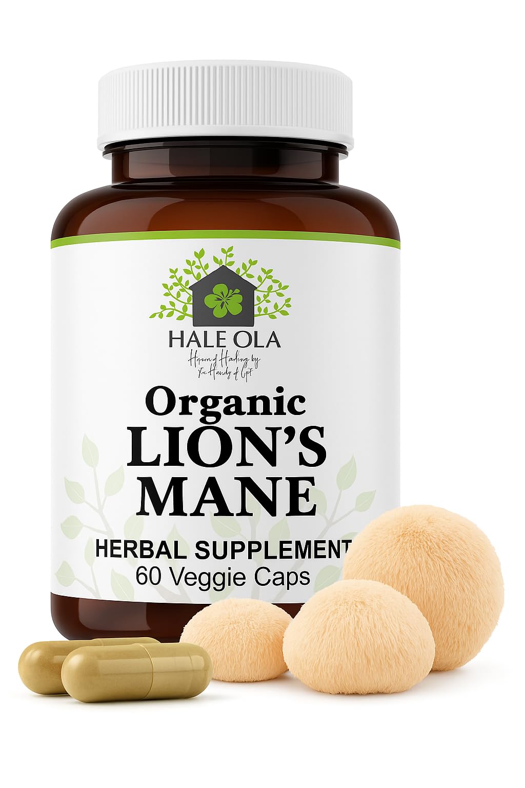 Hale Ola Lions Mane Supplement Capsules - Non-GMO & Kosher Certified Lions Mane Mushroom Capsule for Cognitive Function Nerve Health Brain Cell Growth Improve Focus & Memory - 60 Capsules