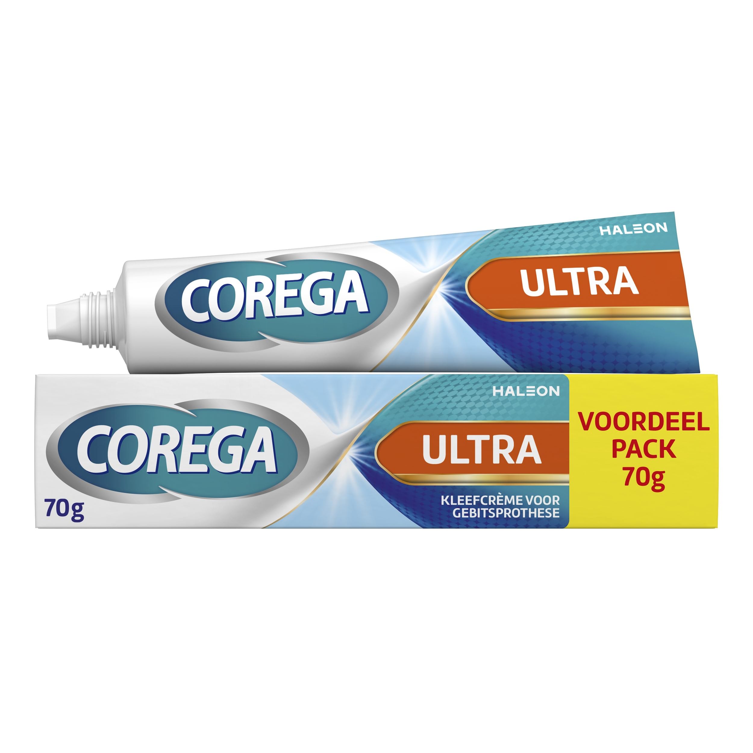 Corega Ultra denture adhesive cream provides a firm hold all day long for a comfortable fixation that helps keep food residue out. You are looking for an adhesive that lasts all day and gives an extra boost of freshness. Corega Ultra is part of the Corega range of zinc-free denture adhesives. It's formulated to last all day, with an extra boost of fresh mint flavor, so you can get close to others. Strong adhesion all day long. Ultra-fresh mint flavor. Zinc-free formulation.Corega Ultra adhesive cream offers a slightly minty taste. Corega Ultra helps prevent food from getting stuck between your dentures and your gums. Corega Ultra provides strong adhesion all day long. Corega Ultra is an adhesive cream for dentures.Corega Ultra Kleefcrème voor de Gebitsprothese 70 g Corega Ultra kleefcrème voor gebitsprotheses geeft de hele dag een stevige houvast voor een comfortabele fixatie die voedselresten helpt buiten te houden. U zoekt een kleefmiddel dat de hele dag aanhoudt én een extra boost van frisheid geeft. Corega Ultra maakt deel uit van het Corega gamma zinkvrije kunstgebitkleefmiddelen. Het is zo geformuleerd dat het een hele dag aanhoudt, mét een extra boost van frisse muntsmaak, zodat u dicht bij anderen kunt komen. Sterke hechting de hele dag lang. Ultrafrisse muntsmaak. Zinkvrije formulering.Corega Ultra kleefcrème biedt een licht muntachtige smaak. Corega Ultra helpt voorkomen dat voedsel vast komt te zitten tussen uw kunstgebit en uw tandvlees. Corega Ultra zorgt een sterke hechting de hele dag lang. Corega Ultra is een kleefcrème voor gebitsprothese.
