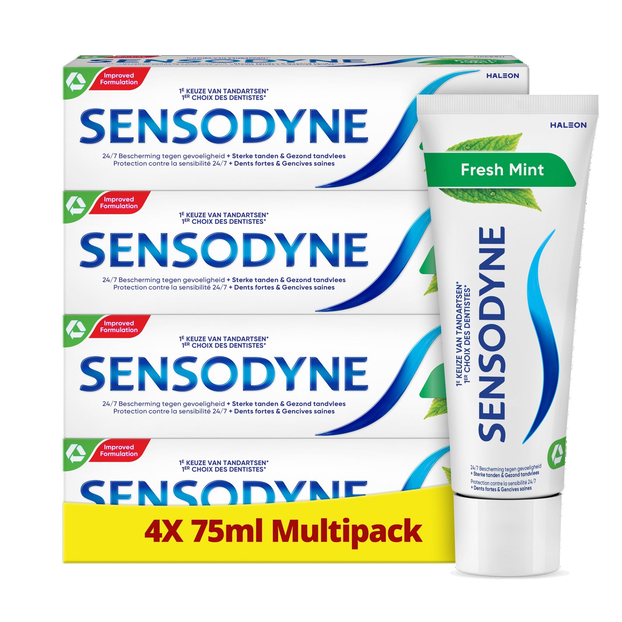 Sensodyne Fresh Mint daily toothpaste provides clinically proven relief and daily protection for sensitive teeth. Brushing twice a day with Sensodyne Fresh Mint daily toothpaste provides 24 7 protection for sensitive teeth and effective cleaning. It contains fluoride, which strengthens tooth enamel and helps protect against caries. Sensodyne Fresh Mint daily toothpaste has a fresh mint flavor. If you suffer from sensitive teeth, you probably have exposed dentin. With exposed dentin, cold or hot food and drinks can irritate the nerve and that can be sensitive. Dentin that is protected by tooth enamel or gums can become exposed due to brushing too hard, teeth grinding and or tooth erosion. INSTRUCTIONS FOR USE Brush twice a day. SAFETY WARNING For abdominal use only. Don't sneak in. Store out of reach of children. Use 2x per day. Discontinue use and consult a dentist if irritation occurs. See moreThe mint flavor makes your mouth feel clean and fresh. Removes plaque when brushing twice a day and contains fluoride that helps protect against caries. Provides 24 7 protection for sensitive teeth and all the benefits of a daily fluoride toothpaste, strong teeth healthy gums.Sensodyne Fresh Mint Tandpasta, 4x75ML Sensodyne Fresh Mint dagelijkse tandpasta geeft klinisch bewezen verlichting en dagelijkse bescherming bij gevoelige tanden. 2 x per dag poetsen met Sensodyne Fresh Mint dagelijkse tandpasta zorgt voor een 24 7 bescherming bij gevoelige tanden en een effectieve reiniging. Het bevat fluoride, dat tandglazuur versterkt en helpt beschermen tegen cariës. Sensodyne Fresh Mint dagelijkse tandpasta heeft een frisse muntsmaak. Als je last hebt van gevoelige tanden, heb je waarschijnlijk blootliggend tandbeen. Bij blootliggend tandbeen kan koud of warm eten en drinken de zenuw prikkelen en dat kan gevoelig zijn. Tandbeen dat beschermd wordt door tandglazuur of tandvlees, kan bloot komen te liggen door te hard poetsen, tandenknarsen en of tanderosie. GEBRUIKSAANWIJZING Poets 2x per dag. VEILIGHEIDSWAARSCHUWING Alleen voor buikgebruik. Sluif niet in. Bewaar buiten bereik van kinderen. Gebruik 2x per dag. Stop met gebruik en raadpleeg een tandarts als irritatie optreedt. Meer bekijkenDoor de muntsmaak voelt je mond schoon en fris. Verwijdert tandplak bij 2 x daags poetsen en bevat fluoride dat helpt beschermen tegen cariës. Biedt 24 7 bescherming bij gevoelige tanden en alle voordelen van een dagelijkse fluoride tandpasta, sterke tanden gezond tandvlees.