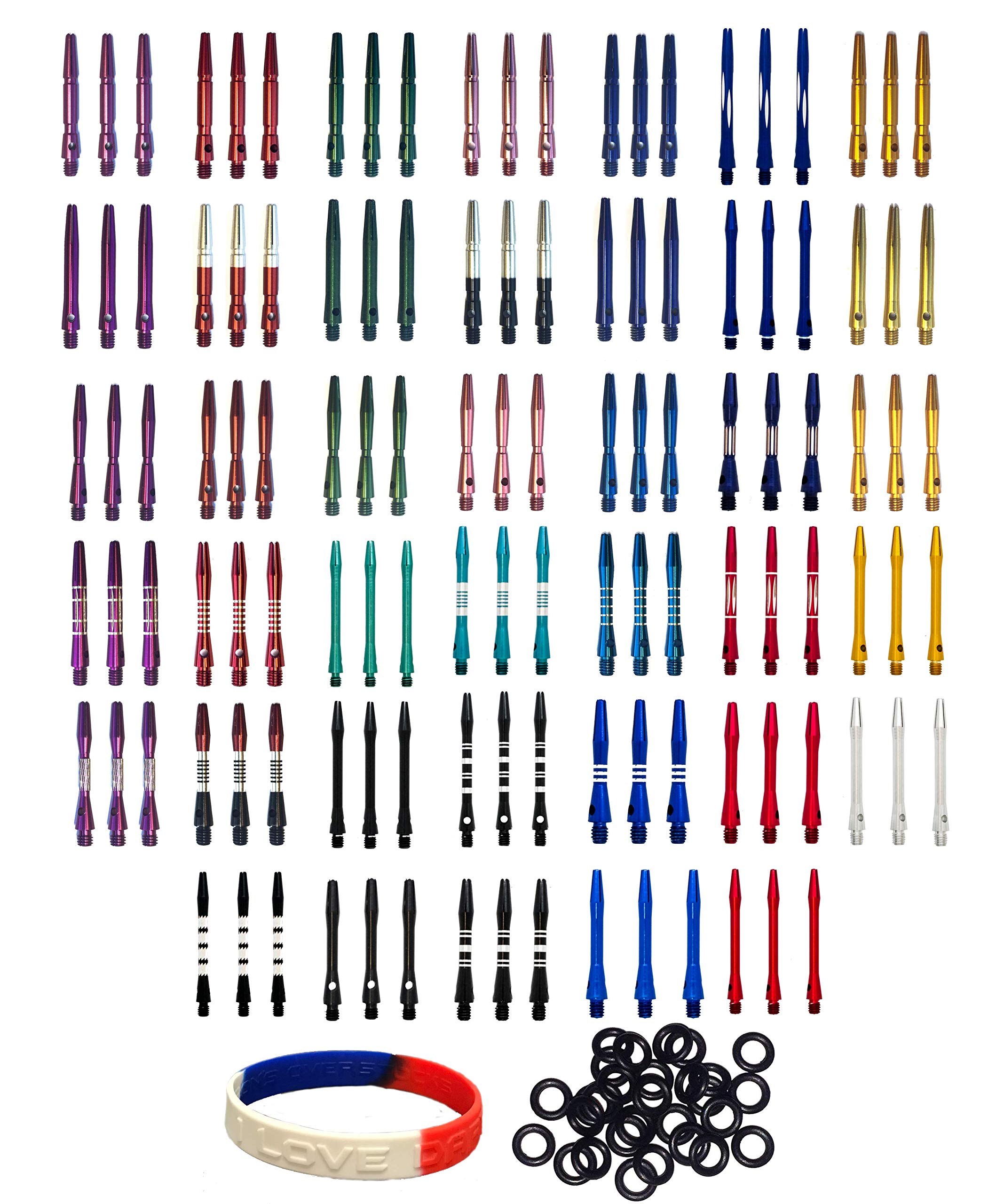 Exclusive "I Love Darts" Bracelet for Aarons Billiards and Darts. Variety of colors and designs. Short & Medium sizes included. 30 O-Rings included. 5 Sets of Aluminum Dart Shafts (15 Total Shafts) or 10 sets of Aluminum Dart Shafts (30 Total Shafts).