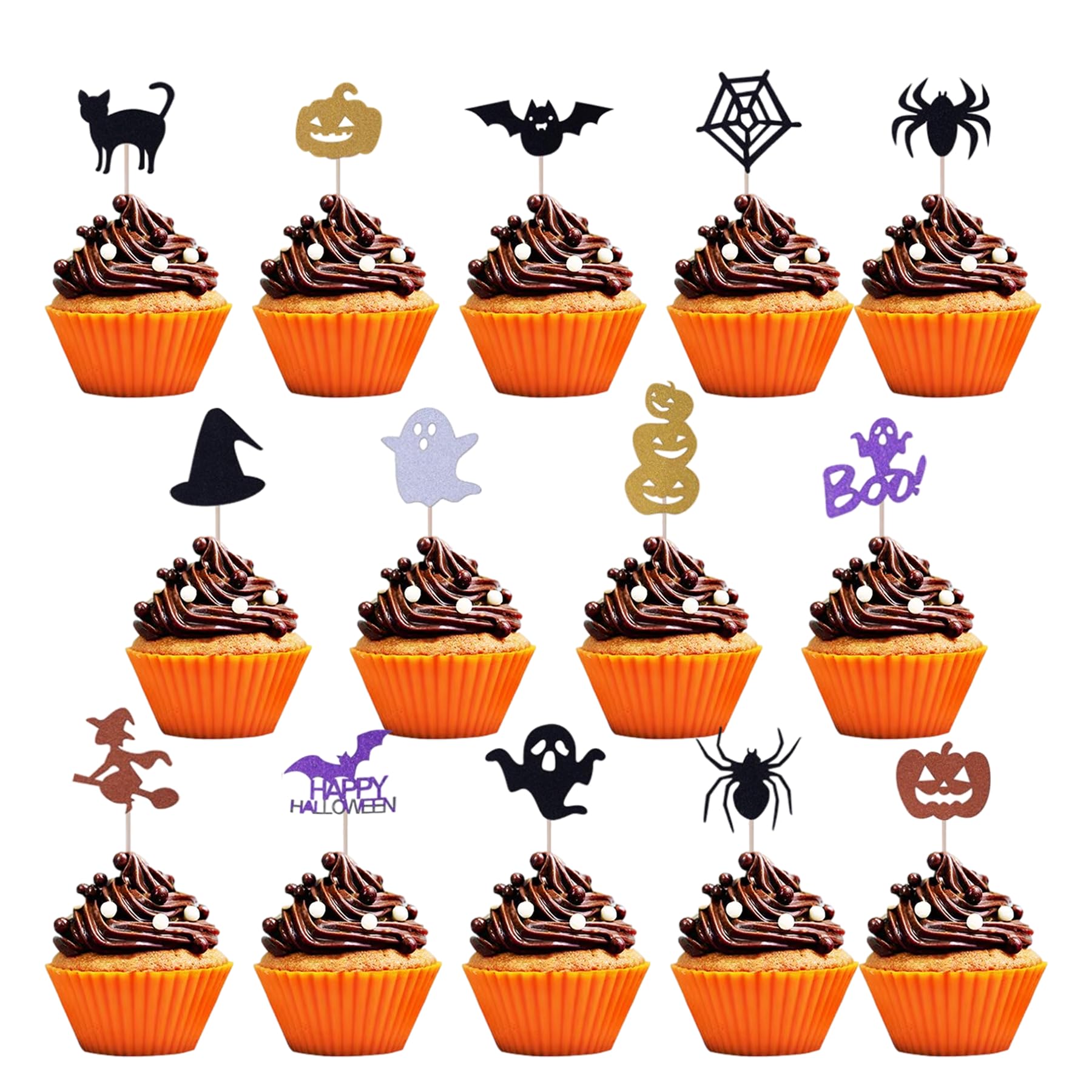 Halloween Cupcake Toppers 28Pcs Cute Cake Decorations Glitter Cupcake Toppers Spider Pumpkin Ghost Bat Cupcake Picks for Halloween Themed Party Supplies (A)