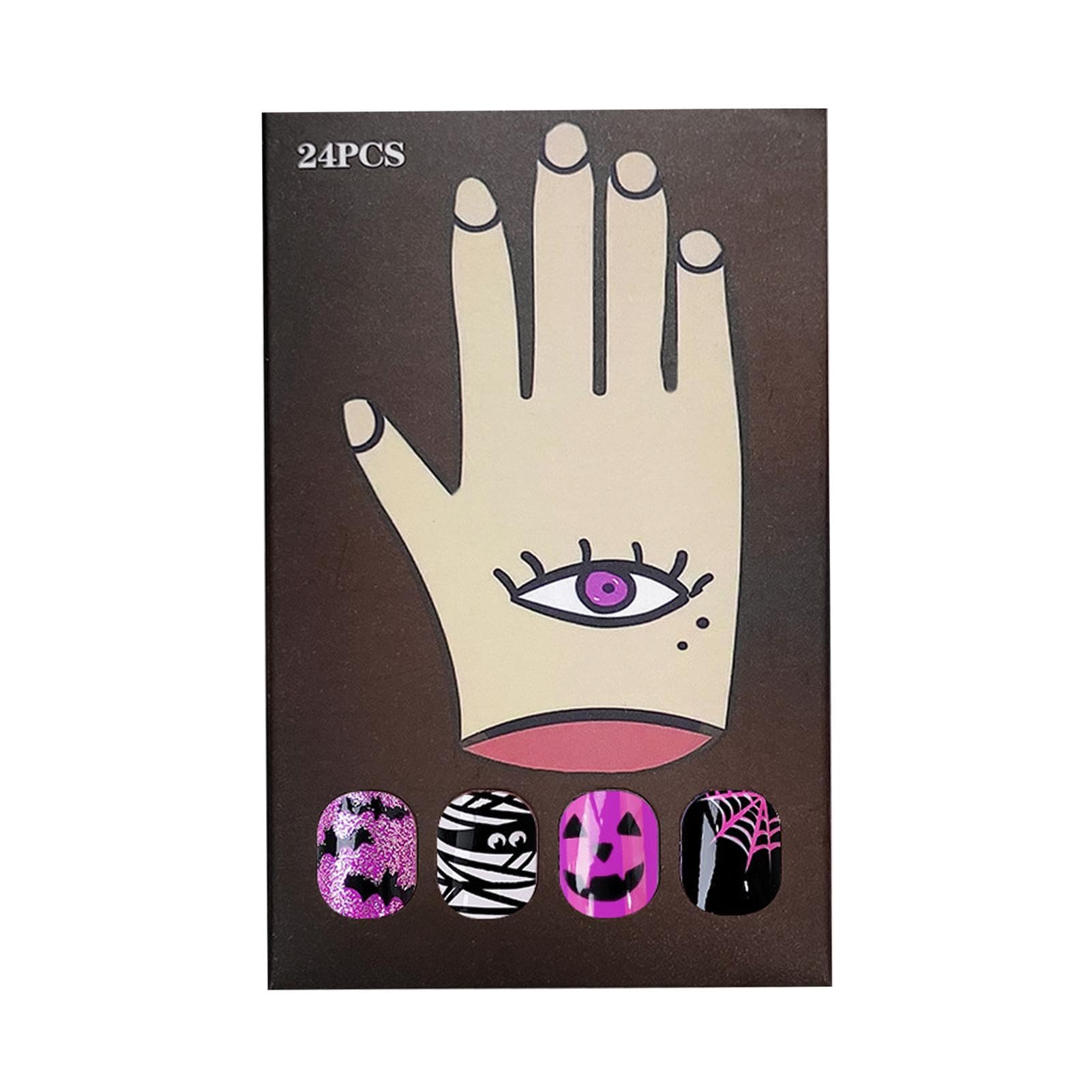 Get into the Halloween spirit with these Short Press on Nails! Featuring ghost faces, bats and spider webs, these nails can be used with confidence for any occasion. Meet your different needs without long wait times at the nail salon. Show off your personality and charm with these trendy and fun nails! Specifications: Product name: Halloween Nail Art Stickers Weight: 20g Packaging size: about 12x7cm 4.72x2.76 inches : artificial fake nails Packing List: 24 Halloween Nail Decals Note: Due to different lighting and screen settings, the item color may be slightly different from the picture. Due to different manual measurements, please allow a 1-2cm difference in size.?Practical Gift Ideas: Boost the spooky essence of Halloween with uniquely designed nail stickers an all-time favorite gift choice for displaying creativity and style, suitable for sisters, girlfriends, wives or mothers. ?Easy Usage: Ditch the salon and create spooky designs with Halloween Nail Stickers. Achieve professional manicure effects at home in just 5-10 minutes without any effort. Get ready for Halloween with ease. ?Fashionable Comfort: Get into the Halloween atmosphere with our 24 nail stickers in 12 different sizes for a stylish short nail design. Enjoy the versatility and convenience of easy application and a perfect fit every time. ?Glittering Halloween Charm: Get noticed with these Halloween nail stickers that feature a mesmerizing glitter effect. These stickers are carefully crafted from high-quality material to a long-lasting shine that's perfect for any occasion. Add a touch of attraction to your look. ?Halloween Charm: Conjure up a bewitching manicure with our nail stickers. Our Halloween Nail Stickers are infused with ghost faces, bats, and spider webs, embodying the classic Halloween elements. The perfect balance of playfulness and horror will give a creative and beautiful finish.
