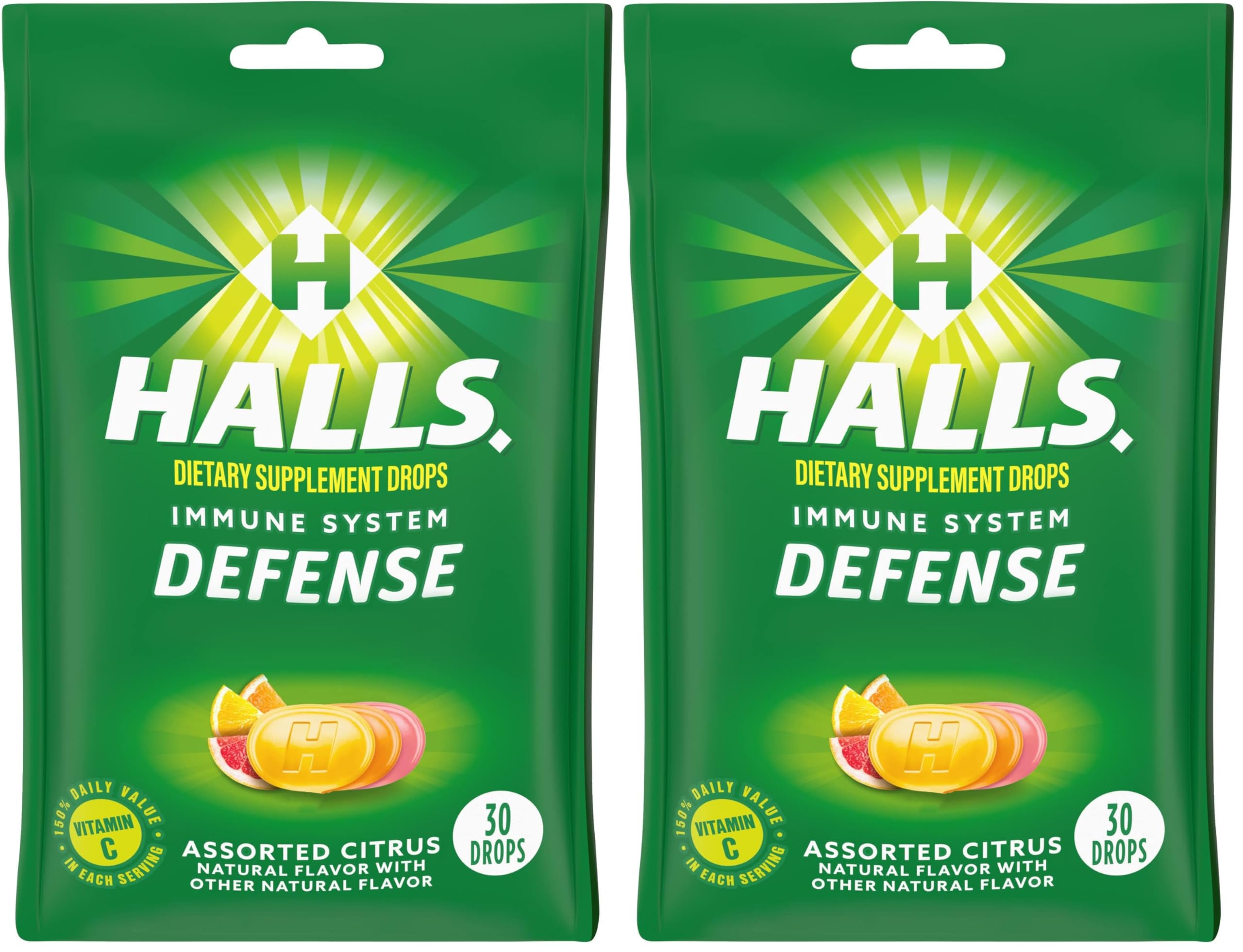 Take two drops by mouth daily, but do not exceed six drops per day. Tasty and refreshing assorted citrus flavors. Citrus drops contain 135 mg of vitamin C in each two drop serving (150 daily value vitamin C in each serving). Dietary supplement contains vitamin C as an immune system booster. One package of 30 HALLS Defense Assorted Citrus Vitamin C Drops (packaging may vary). The below information is per pack only.