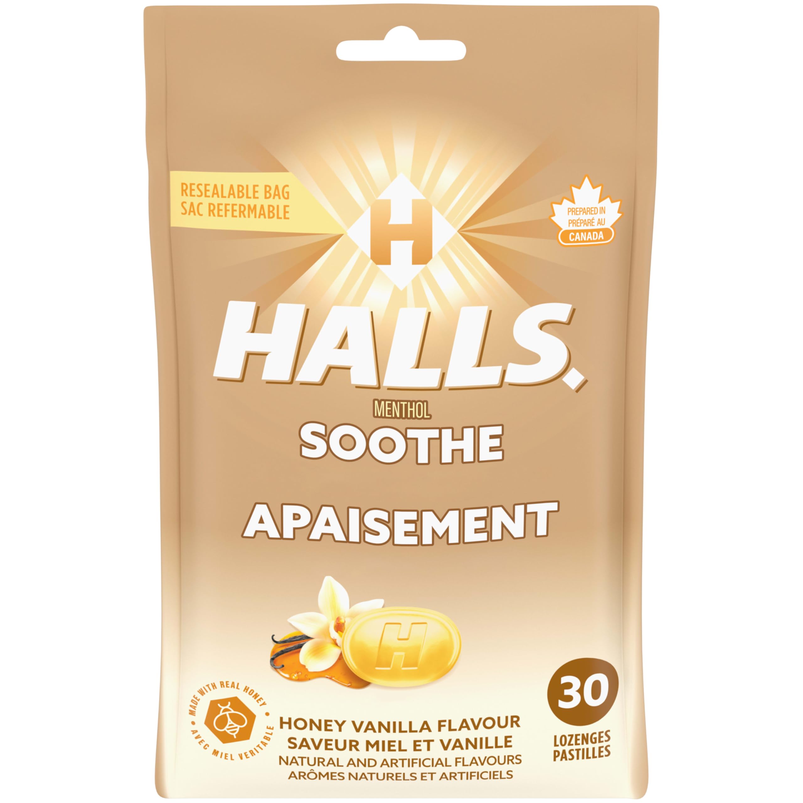 HALLS Menthol Honey Vanilla 30 Count BagAlways read and follow the label. HALLS for the temporary relief of sore throat, cough and nasal congestion. Stay prepared for cold and allergy season with HALLS lozenges. Made with real honey. Take HALLS Honey Vanilla cough drops to relieve coughs and soothe sore throats. This HALLS product is a bag of 30 lozenges.