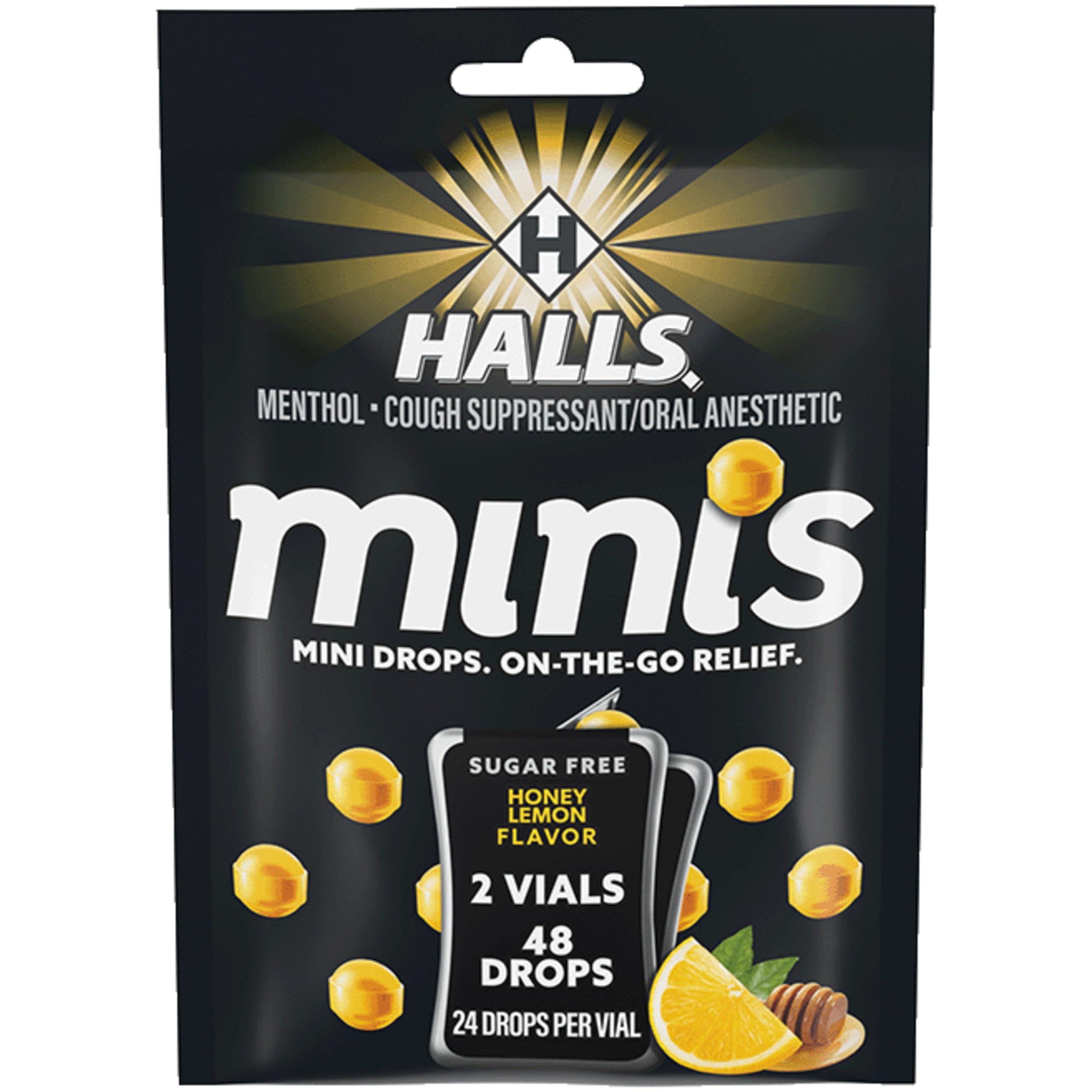 Convenient flip-top packs of honey lemon cough drops for on-the-go cough relief great for tossing in tote bags, purses, and backpacks or keeping in a desk drawer, car glove compartment, and more for when symptoms strike. Mini sore throat lozenges that soothe sore throats and provide temporary cough relief use as directed. Sugar free cough drops made with 2.5 mg of menthol per drop to act as an oral anesthetic or cough suppressant. HALLS throat drops for sore throat and cough relief with an enjoyable honey lemon flavor. One bag containing two 24-count flip-top packs of HALLS Minis Honey Lemon Flavor Sugar Free Cough Drops (48 total drops).