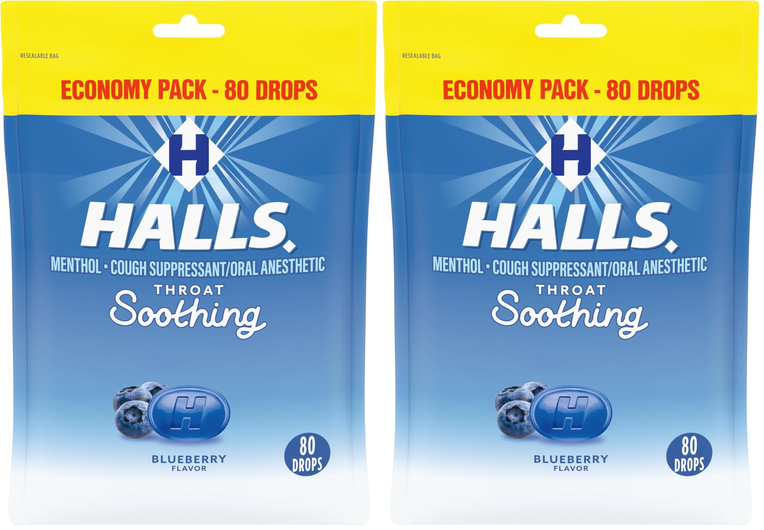 Individually wrapped cough relief drops in a resealable bag for on-the-go convenience and accessibility for whenever symptoms strike. Sore throat lozenges that soothe sore throats and provide temporary cough relief use as directed. Cough relief drops made with 2.5 mg of menthol per drop to act as an oral anesthetic or cough suppressant. Soothing HALLS throat drops with an enjoyable blueberry flavor. One economy bag of 80 HALLS Throat Soothing Blueberry Cough Drops. The information below is per-pack only.