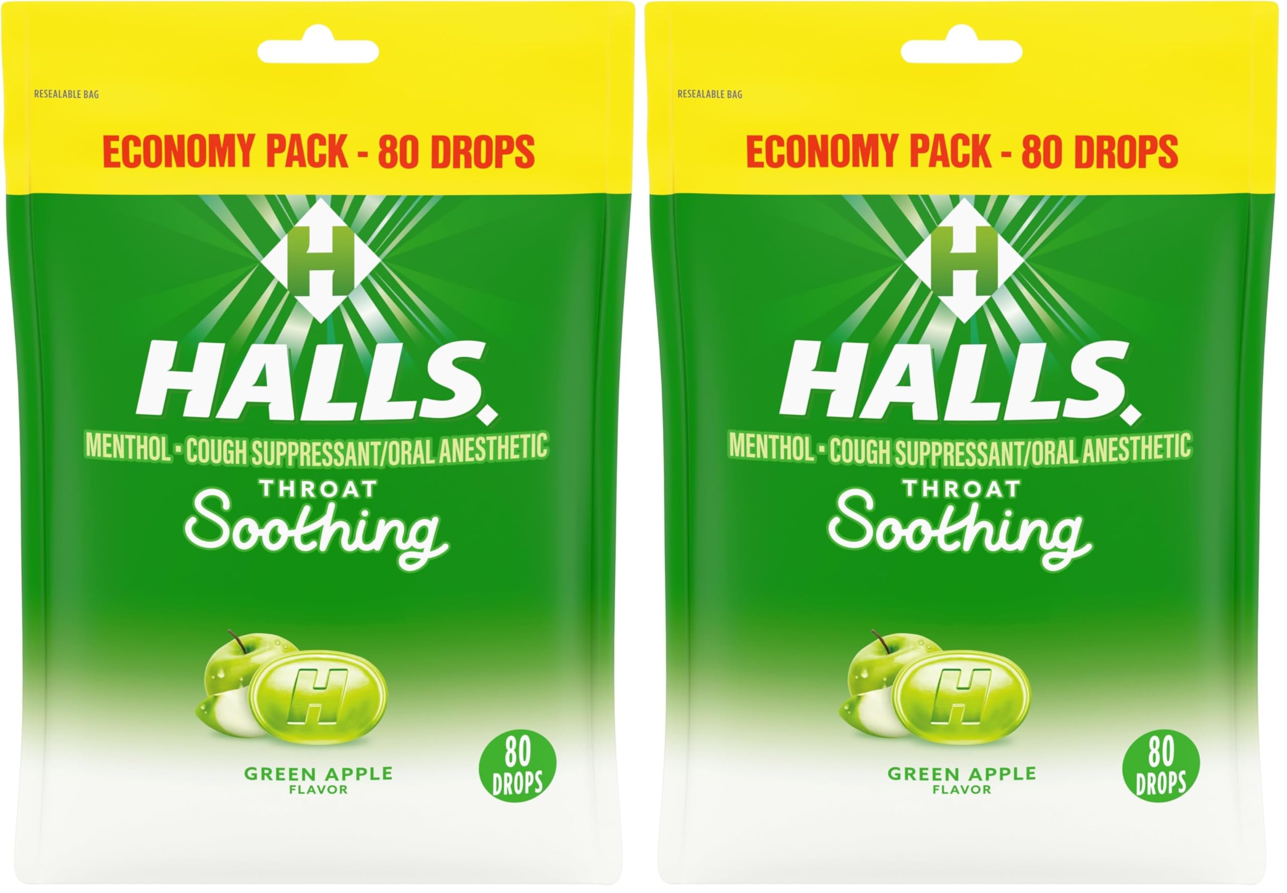 Individually wrapped cough relief drops in a resealable bag for on-the-go convenience and accessibility for whenever symptoms strike. Sore throat lozenges that soothe sore throats and provide temporary cough relief use as directed. Cough relief drops made with 2.5 mg of menthol per drop to act as an oral anesthetic or cough suppressant. Soothing HALLS throat drops with an enjoyable green apple flavor. One economy bag of 80 HALLS Throat Soothing Green Apple Cough Drops. The information below is per-pack only.