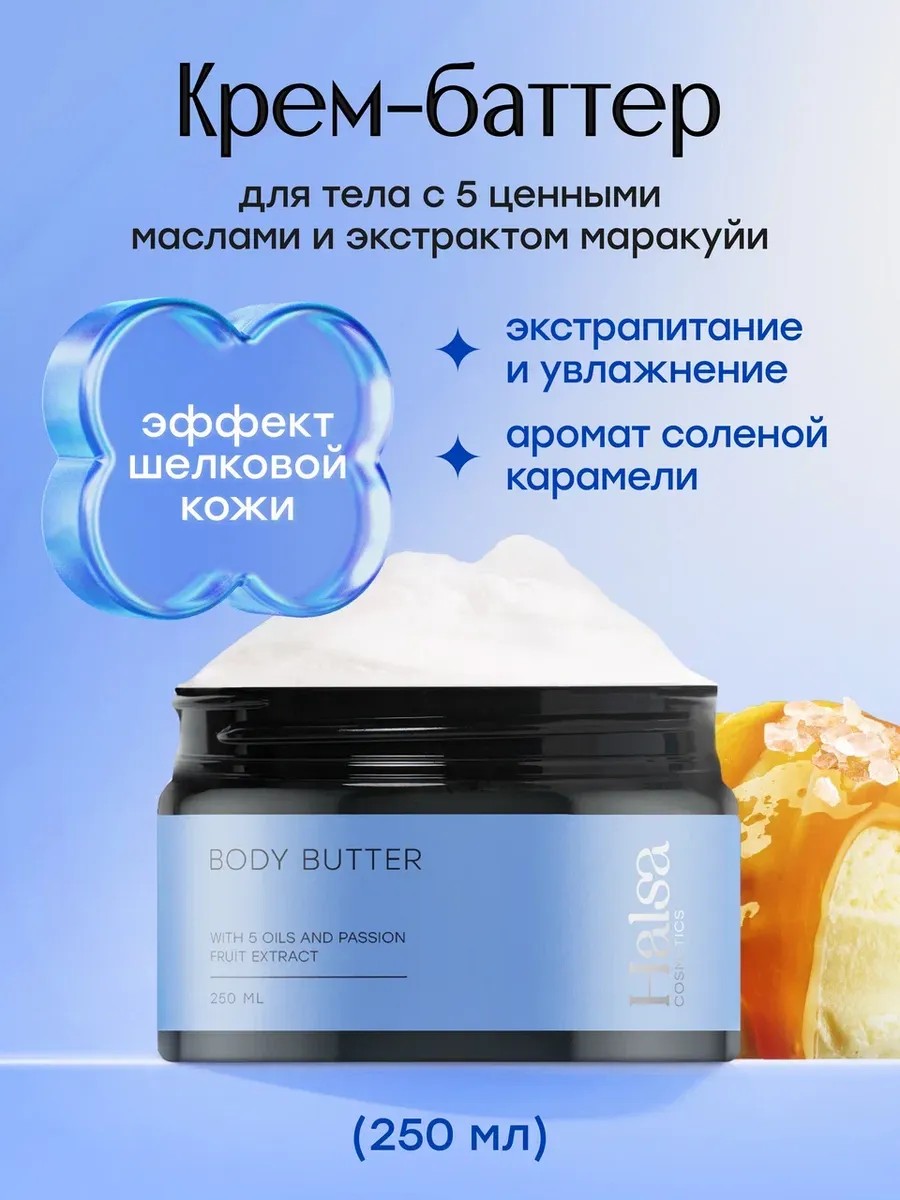 Нежный крем-баттер для тела Halsa Cosmetics body cream 250 мл с вкусным ароматом соленой карамели идеально подходит для использования после бани, душа или ванны, обеспечивая непрерывное увлажнение и защиту кожи от растяжек. Увлажняющий и питательный состав баттера, обогащенный витамином Е (токоферол), органическими маслами и экстрактом маракуйи, наполняет кожу сиянием, придавая ей шелковую гладкость.