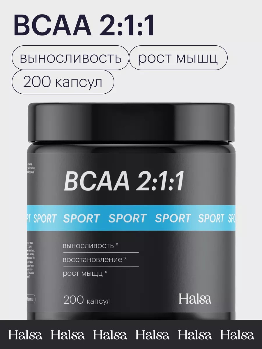 BCAA Halsa dietary supplement contains essential organic amino acids: L-leucine (750–1500 mg in 3–6 capsules), L-isoleucine (375–750 mg), and L-valine (375–750 mg), in an optimal ratio of 2:1:1. These amino acids are crucial for improving the effectiveness of athletic training.