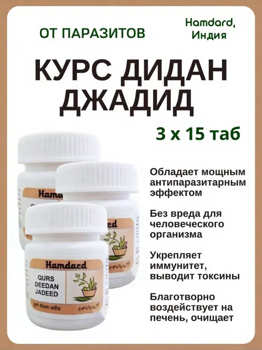 Курс Дидан Джадид - натуральный аюрведический препарат, угнетающий паразитов в тонком и толстом кишечнике. Обладает мощным антипаразитарным эффектом, без вреда для человеческого организма, так как не содержит химических добавок. Выводит продукты жизнедеятельности паразитов, уничтожает яйца и личинки. Подходит для лечения детей. Освобождая организм от паразитов, препарат очищает его, чем улучшает общее самочувствие человека, аппетит и усвоение пищи, воздействие на организм других препаратов, устраняет дисбактериоз и прочие последствия паразитарной инвазии. Курс Дидан Джадид также защищает печень от отравления продуктами жизнедеятельности паразитов, усиливает выработку желчи, укрепляет иммунитет, выводит токсины, а также способствует нормализации уровня холестерина и сахара в крови, препятствует появлению тромбоза. Данный препарат можно употреблять в профилактических целях, при выявлении гельминтов у членов семьи, при постоянном контакте с домашними животными. Показания к применению: Гельминтозы тонкого и толстого кишечника; Лямблиоз; Дисбактериоз; Заражение нематодами (Cutaneous Larva Migrans, Strongiloides stercoralis, Ascaris lumbricoides, Triсhiurus triсhiura, Necator americanus, Enterobius vermicularis, Ancylostoma duodenale), цестодами (Taenia saginata, Taenia solium и Hymenolepsis nana), трематодами (Clonorchis sinensis и Opisthorhis viverrini), простейшими (Giardia lamblia). Применение: Взрослым и детям старше 12 лет: по 1-2 таблетки 1 раз в день рано утром или перед сном, курсом 15 дней. Детям 3-12 лет: принимать по ½ -1 таблетке 1 раз в день рано утром или перед сном, курсом 15 дней. Эффективность увеличивается при совместном приеме с трифалой (по 1-2 таблетки утром и вечером). Во время приема препарата рекомендуется не переедать, избегать острой, жареной, жирной и копченой пищи, пить не менее 6-8 стаканов воды в сутки. Противопоказания: индивидуальная непереносимость компонентов. Не является лекарственным препаратом и не заменяет традиционного медицинского лечения. Перед применением рекомендуется проконсультироваться со специалистом по Аюрведе для индивидуального назначения.