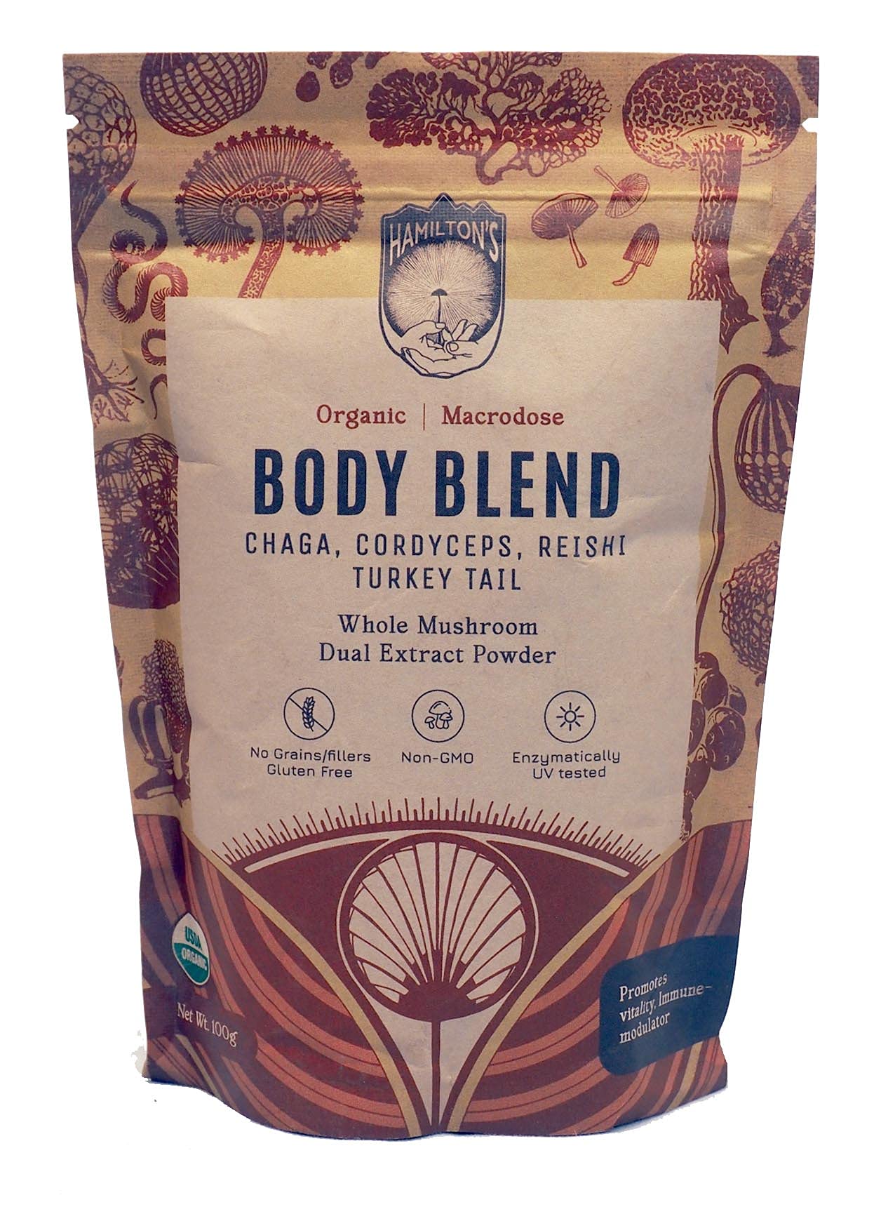 Hamilton s Body Blend | Chaga Cordyceps Reishi Turkey Tail | Organic Mushroom Extract Powder for Immune Endurance and Stress Support | High Potency | 30% Beta Glucans | GF Non-GMO Vegan (100g) 3.53 Ounce (Pack of 1)