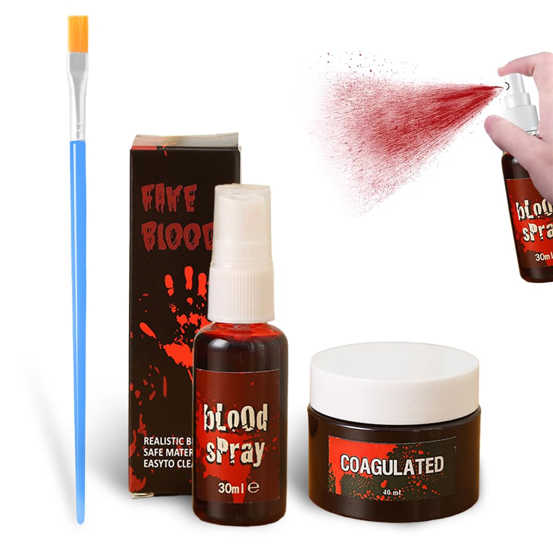 This Halloween fake blood set (40 ml gel 30 ml spray) is the ideal accessory for creating ultra-realistic horror effects at parties, cosplay or theater productions. The thick gel perfectly imitates open wounds, scabs and cuts, while the spray generates spectacular splashes, perfect for zombie, vampire or terrifying clown looks. The product is skin-friendly, non-toxic and easy to apply. It can be used on face, neck, arms, legs and on stage clothing and accessories. The use is intuitive: apply the gel to simulate local wounds, use the spray for a splashing big effect. After use, it can be easily removed with lukewarm water and soap or with a mild make-up remover for stubborn residues. A must-have for your realistic horror makeup on Halloween, carnival, cinema or shows.Versatile for All Occasions: Perfect for horror makeup, zombies, vampires, clowns, gore movies, carnivals, costume parties and professional special effects. Easy to clean: remove with lukewarm water and soap. For stubborn stains, use a gentle make-up remover or a suitable fabric cleaner. Simple and effective use: the gel is applied directly to create realistic deep wounds, while the spray reproduces natural blood spurts on the skin, clothing or accessories. Safe and skin-friendly ingredients: formulated with non-toxic components, suitable for face and body. Recommended to test on a small area before full use. Realistic Factice blood set: contains 1 x 40 ml thick gel for simulating open scabs and wounds and 1 x 30 ml spray for dynamic splashes. Ideal for Halloween, cosplay and theater.Halloween kunstbloed set, 40 ml gel 30 ml, spray, realistisch bloed voor make-up, speciale effecten, zombie vampier clown, gemakkelijk te reinigen, cosplay en horrorfeest Deze Halloween-nepbloedset (40 ml gel 30 ml spray) is het ideale accessoire voor het creëren van ultra-realistische horroreffecten op feestjes, cosplay of theaterproducties. De dikke gel imiteert perfect open wonden, korsten en snijwonden, terwijl de spray spectaculaire spatten genereert, perfect voor zombie-, vampier- of angstaanjagende clownlooks. Het product is huidvriendelijk, niet giftig en gemakkelijk aan te brengen. Het kan worden gebruikt op gezicht, nek, armen, benen en op podiumkleding en accessoires. Het gebruik is intuïtief: breng de gel aan om plaatselijke wonden te simuleren, gebruik de spray voor een spattend big effect. Na gebruik kan het gemakkelijk met lauw water en zeep of met een milde make-up remover voor hardnekkige resten worden verwijderd. Een must-have voor je realistische horrormake-up op Halloween, carnaval, bioscoop of shows.Veelzijdig voor alle gelegenheden: perfect voor horrormake-up, zombies, vampiers, clowns, gore-films, carnaval, kostuumfeesten en professionele speciale effecten. Gemakkelijk te reinigen: met lauw water en zeep te verwijderen. Gebruik voor hardnekkige vlekken een zachte make-up remover of een geschikte textielreiniger. Eenvoudig en effectief gebruik: de gel wordt direct aangebracht om realistische diepe wonden te creëren, terwijl de spray natuurlijke bloedspuiten op de huid, kleding of accessoires reproduceert. Veilige en huidvriendelijke ingrediënten: samengesteld met niet-giftige componenten, geschikt voor gezicht en lichaam. Aanbevolen om voor volledig gebruik op een klein gebied te testen. Realistische Factice bloedset: bevat 1 x 40 ml dikke gel voor het simuleren van open korsten en wonden en 1 x 30 ml spray voor dynamische spatten. Ideaal voor Halloween, cosplay en theater.