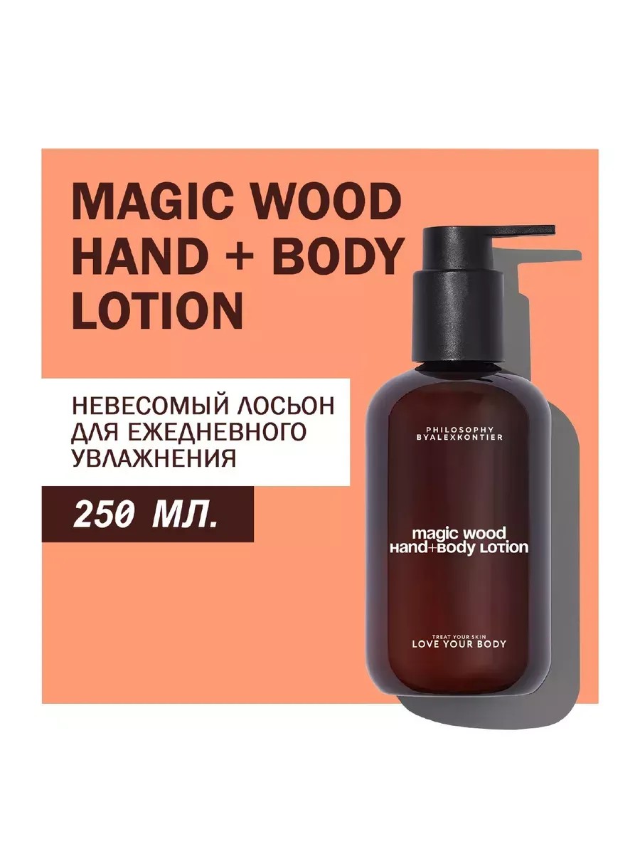 A lotion for quick hydration, protection, and restoration of the skin. To relieve dryness and irritation after exposure to the sun. Nourishment and hydration with a noticeable lifting effect. How to use: Apply the required amount of cream with light massage movements to clean and dry skin morning or evening, allow time for absorption. For maximum effect, we recommend combining the lotion with the gentle cleansing gel Magic Wood HAND + BODY WASH. Suitable for all skin types. Benefits: Contains D-panthenol, hyaluronic acid, argan oil, grape seed oil, olive oil, jojoba oil, oat oil. Complex for protecting the skin microbiome. Plant-based squalane. Aloe vera gel. Natural moisturizing factor. Lactic acid. Complex of peptides and amino acids. Licorice extract. Vitamin E - antioxidant, vitamin F - strengthens the skin barrier. Packaging made of recycled plastic. What to expect: Protected and restored skin, without dryness, tightness, irritation, or redness. Smooth, supple, nourished, healthy skin with a natural radiance. Absorbs quickly, without stickiness. Fragrance Pyramid: Top notes of tobacco leaf, spices, and mandarin lead to a heart of iris, rose, and patchouli, which lies on a base of amber, moss, tree bark, young larch leaves, and sweet balms.