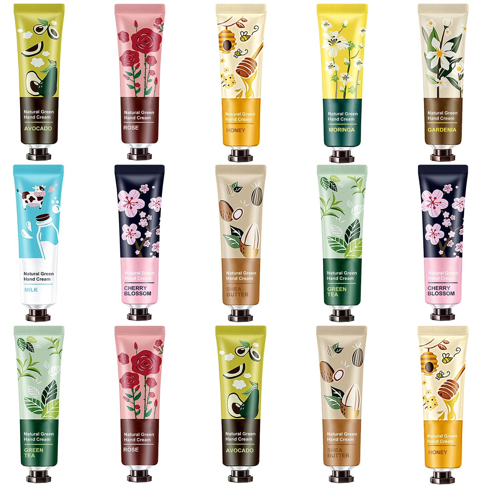 15 Pack Natural Plants Fragrances Hand Creams : Two GREEN TEA,Two SHEA BUTTER,Two ROSE,Two AVOCADO,Two HONEY,One BLUEBERRY,One MILK,One CHERRY BLOSSOM,One GARDENIA,One MORINGA . Featuring fresh and sweet fragrances, these aromatic smells lift your spirit and bring you energy. These deeply hydrating and moisturizing hand creams make your hands silky-soft, smooth and rejuvenated.