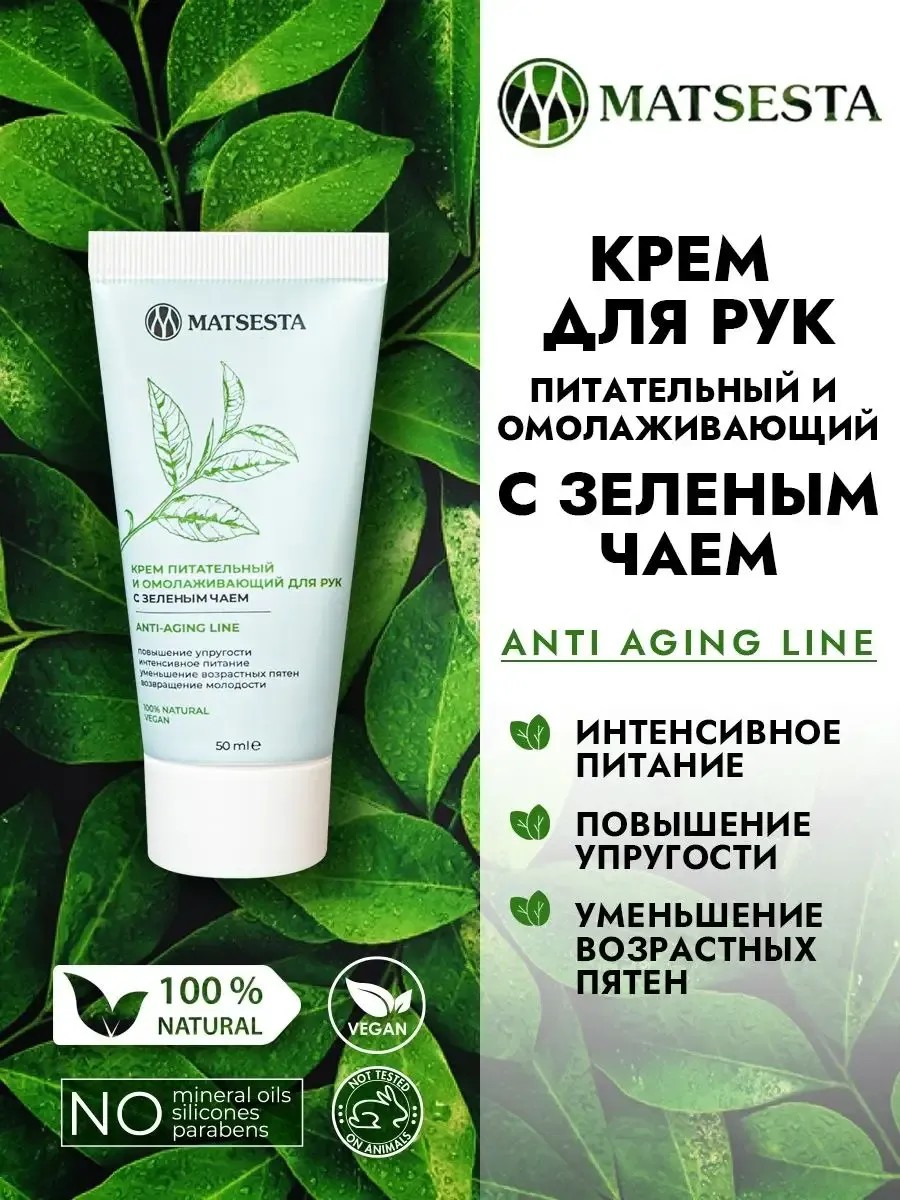 Крем питательный и омолаживающий для рук от Matsesta разработан для ухода за сухой обезвоженной и нормальной кожей. Комплекс витаминов, растительных экстрактов и природных масел в составе повышают защитные функции кожи, питают и омолаживают. Натуральный крем с зеленым чаем – это антивозрастной уход за руками, который идеально подходит для проблемной кожи. Благодаря содержанию природной воды мацеста, гидролата зеленого чая, масла авокадо кокоса и касторового, а также витамина Е, питает кожу и улучшает ее структуру. Экстракт календулы и гинкго билоба оказывают омолаживающее действие, повышают упругость и защищают от свободных радикалов. Эфирное масло испанского лимона обладает антисептическим и освежающим эффектом, а также устраняет неприятный запах на руках. Увлажняющий крем - это незаменимый продукт для ежедневного ухода за кожей рук. Он быстро впитывается, не оставляя жирной пленки, и дарит ощущение комфорта и увлажнения. Благодаря формуле с омолаживающими свойствами, помогает сократить появление морщин и улучшить текстуру кожи. Уходовая органическая косметика для красоты также восстанавливает естественный водный баланс и препятствует потере влаги. Профессиональный уход с эффектом бархатные ручки. Натуральная косметика Мацеста - идеальный подарок на 14 февраля, 8 марта и День рождения себе или для любимой мамы, девушки или жены!!