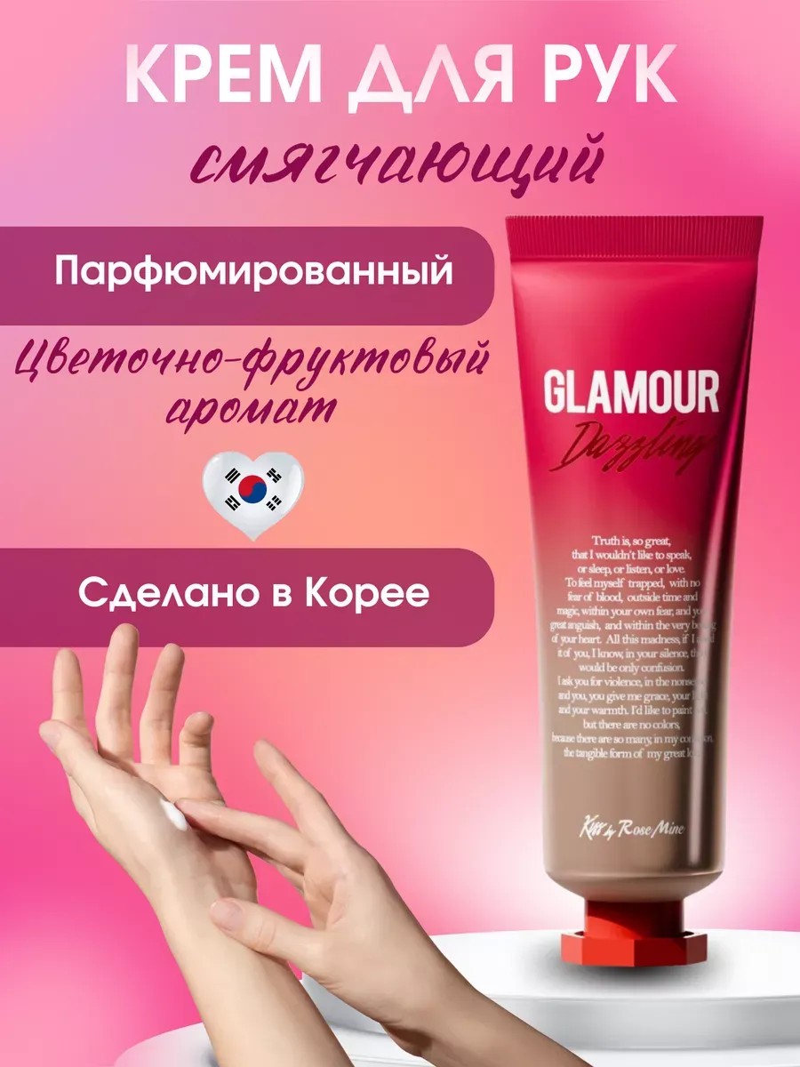 Fragrance Hand Cream - Glamour Fantasy Hand Cream by Kiss by Rosemine. The delightful and juicy aroma of fresh apple, intertwined with the floral and fruity notes of ylang-ylang, envelops you in warmth and invigorates. Contains a special combination of moisturizing ingredients: hyaluronic acid, shea butter, macadamia oil, mango seed oil, rose oil, hydrolyzed silk, honey extract, and ceramide, which prevent moisture evaporation, nourish the skin of the hands, eliminate dryness and flaking, improve healing, and protect against the effects of negative external factors. Acai berry, blackberry, blueberry, and raspberry extracts infuse antioxidants, even out skin tone, and smooth the surface of the skin. Rose water, panthenol, and extracts of calendula, chamomile, lotus, daisy, chrysanthemum, camellia, elderberry, and evening primrose flowers moisturize, soften, and soothe the skin of your hands, accelerating the healing of microtraumas and cracks. Korean cosmetics are known for their caring properties, and this cream is no exception: it restores softness and smoothness to your hands, eliminating dryness and flaking. This Korean hand cream intensely moisturizes, nourishes, and protects against the effects of negative external factors. This perfumed cream has a light and delicate texture, absorbs quickly, and doesn't leave a sticky feeling on the skin, which is very important.