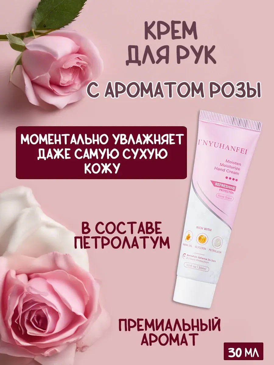 Откройте для себя идеальный крем для рук I'NYUHANFEI, который обеспечивает увлажнение, питание, защиту и восстановление вашей кожи. Нежная текстура средства по уходу за руками мгновенно впитывается, не оставляя липкости, и омолаживает кожу, делая её мягкой и эластичной. Благодаря содержанию петролатума и натуральных компонентов, крем идеально подходит для всех типов кожи, включая сухую и нормальную. Подходит для ежедневного применения. Премиальная отдушка розы придаёт крему изысканный аромат, который подарит вам ощущение свежести и комфорта. Защитите свои руки с этим потрясающим косметическим средством уже сегодня! Питательный уходовый бальзам для рук — это незаменимый помощник в уходе за кожей. Он помогает сохранить молодость и красоту ваших рук, делая их мягкими, гладкими и ухоженными. В состав крема входят только высококачественные ингредиенты, которые бережно ухаживают за кожей, не вызывая аллергических реакций и раздражений. Состав быстро впитывается, не оставляя жирных следов, и создаёт на поверхности кожи невидимую плёнку, которая защищает от вредного воздействия окружающей среды. Регулярное использование нашего продукта для рук поможет предотвратить появление сухости, трещин и шелушения, а также улучшит общее состояние кожи. Ваши руки станут мягкими, гладкими и ухоженными, как никогда раньше. Не упустите возможность приобрести этот замечательный мини-крем для рук и подарите своим рукам заботу и уход, которые они заслуживают.