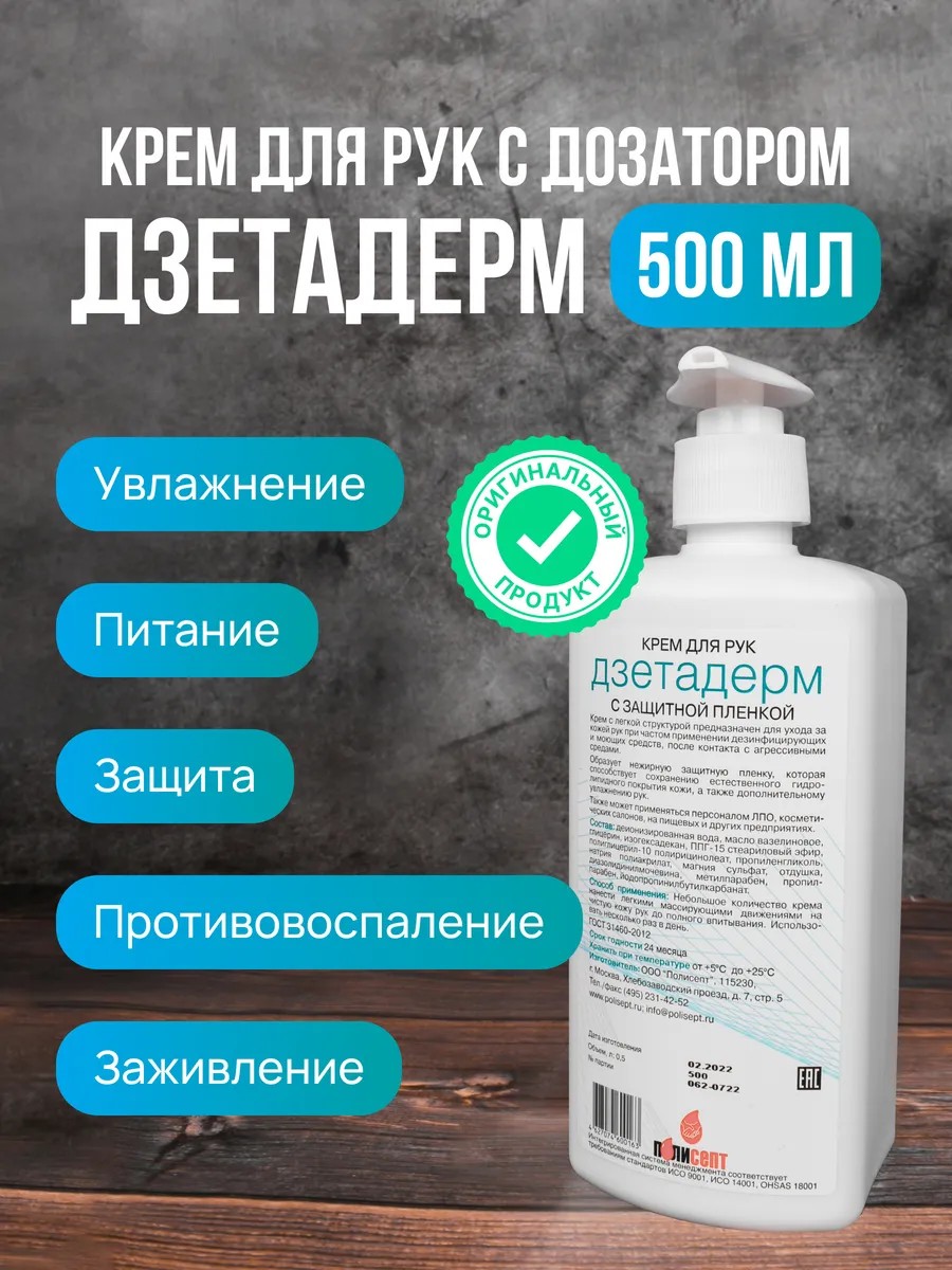 | Комплектация | Крем для рук защитный Дзетадерм 500 мл с дозатором |