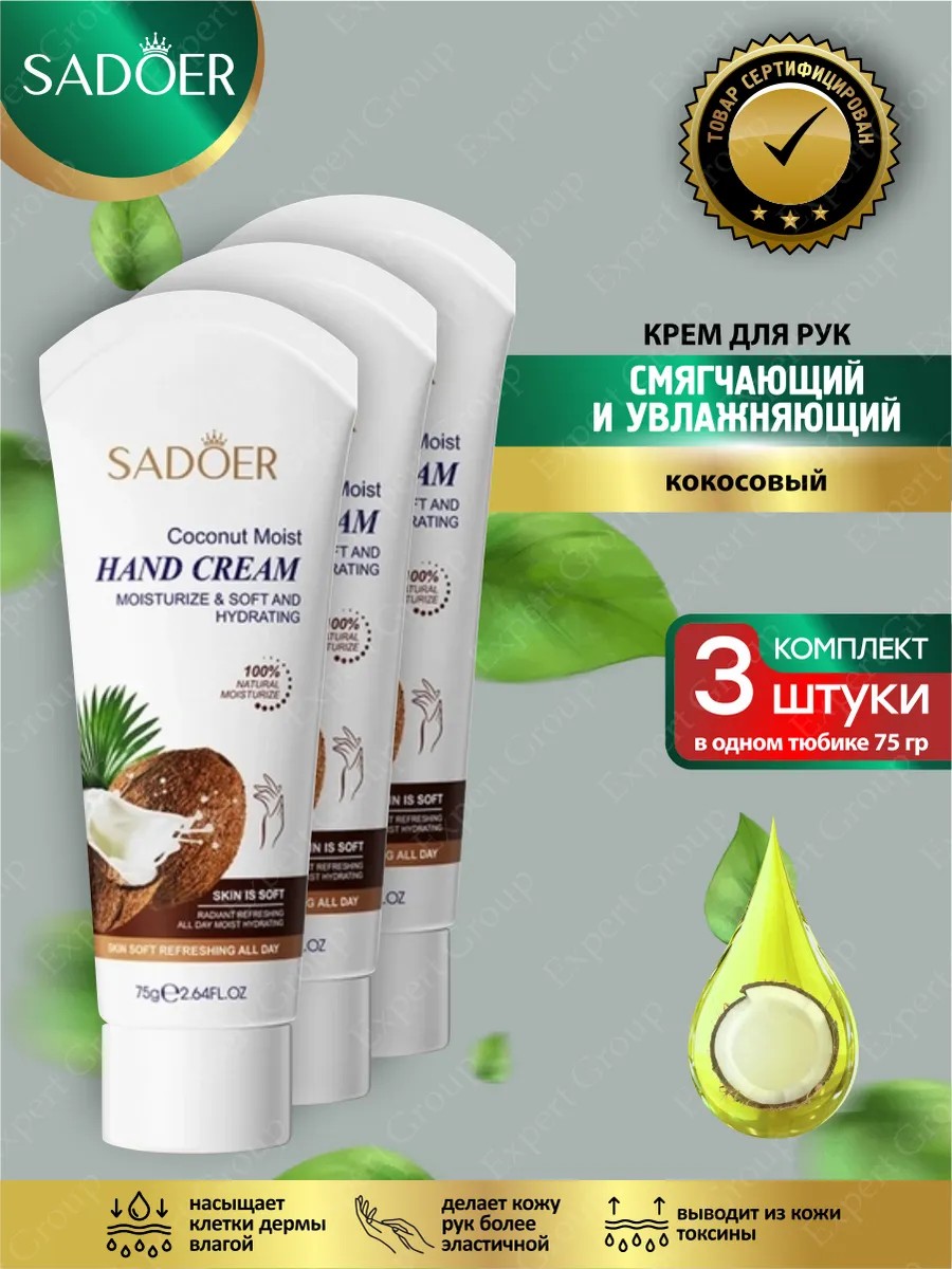 | Комплектация | Смягчающий и увлажняющий крем для рук Sadoer кокосовый 75 гр х 3 шт. |