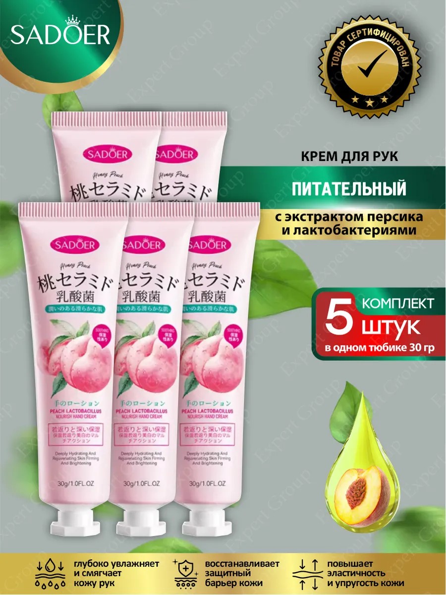 | Комплектация | Питательный крем для рук Sadoer с экстрактом персика и лактобактериями 30 гр х 5 шт. |