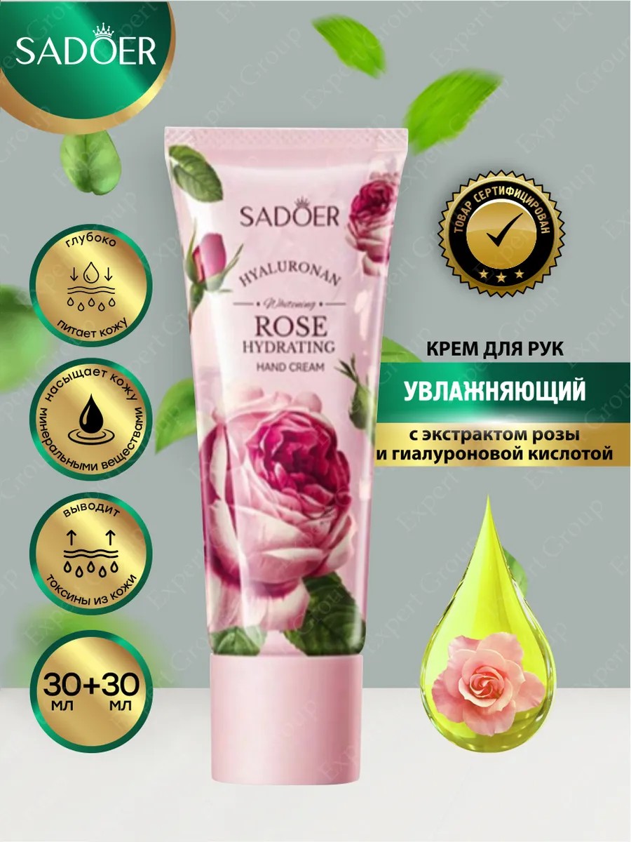 КомплектацияУвлажняющий крем для рук Sadoer с экстрактом розы и гиалуроновой кислотой 30 мл. + 30 мл.