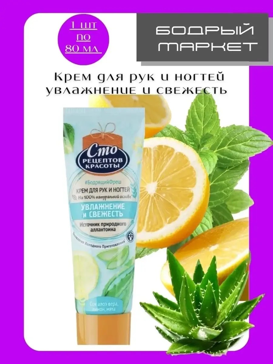 Крем для рук и ногтей Сто Рецептов Красоты Увлажнение и свежесть на основе алоэ, оливкового масла и лимонного сока превосходно увлажняет кожу рук, смягчает кутикулу и способствует укреплению ногтей. Активные компоненты рецепта известны своими полезными свойствами в косметологии: Сок алоэ-вера стимулирует регенерацию тканей за счет восстановления обмена веществ, ускорения циркуляции крови, увлажнения, размягчения и отшелушиванию мертвых ороговевших клеток кожи. Так же сок помогает при воспалениях, раздражения кожи и угревой сыпи, препятствует образованию рубцов, покрывает кожу защитным слоем, тем самым препятствуя росту болезнетворных бактерий и грибковых инфекций. Лимон – стимулирует процесс регенерации клеток кожи и освежает. Мята - способствует восстановлению питания кожи, нормализует работу сальных желез, стимулирует кровообращение. Ментол, входящий в состав мятного масла, великолепно охлаждает и освежает кожу, стимулирует кровообращение и укрепляет сосуды, выводит токсины, успокаивает. Оливковое масло обладает восстанавливающими и увлажняющими свойствами, широко используется в антивозрастной терапии. Результат увлажненная и ухоженная кожа рук за считанные минуты!