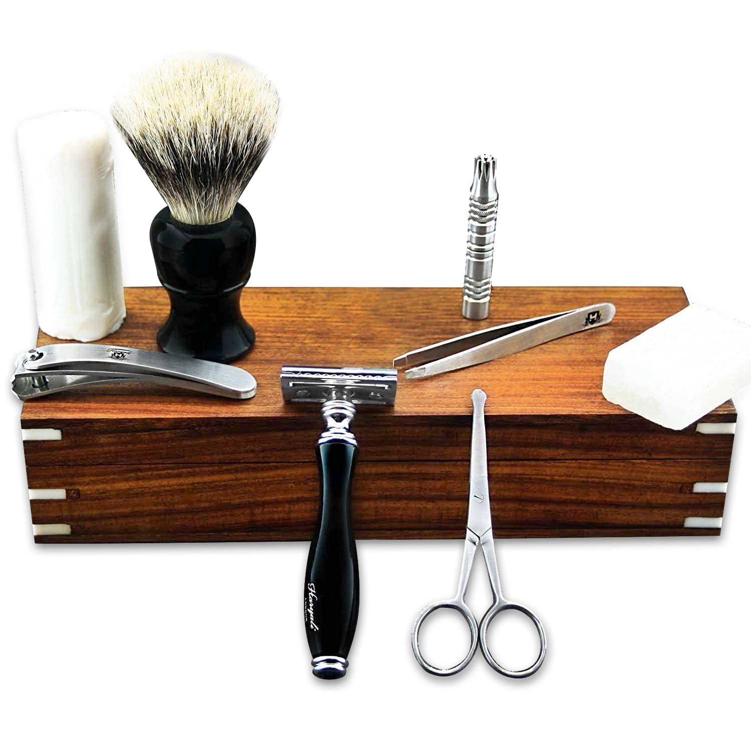 Sophist Collection: Safety razor This unique razor planer has a specially developed handle. The Haryali London Sophist Collection is the best choice for experienced wet razors. Presents a special character, elegance and perfection. Designed with a harmonious shape and superior material, it doesn't just look like a work of art in your shaving cave, But its shape ensures a pleasant shaving experience. Silver tip Silver lace bathroom handcrafted, the silver tip roof hair shaving brush is only assembled using the finest materials. The natural hair is untreated and show special features such as the shimmering silver color and the black band that runs in the middle of the brush hair. The brush floor is formed without the help of scissors that cuts the tips of the hair;This is a long process In this way you get the soft and best foam tips for an amazingly soft application. ? total height: 10 cm hair length: 5 cm Rose boxes so that you can keep your new tools in the safest way, this beautifully processed rosewood box will look fantastic in every room. ? Width: 10.5cm length: 25.5cm height: 6.5cm ? 625g Contents: ? 1 x silver tip-roof rasier brush ? 1 x double edge razor planer ? 1 x shaving soap ? 1 x steel tweezers ? 1 x nasal cutter ? 1 x nasal scissors ? 1 x nail cutter ? 1 x alumer block ? 1 x rosewander box safety weighty head offers great balance and control and offers an extremely tight and comfortable shave.Dachshair is the only type of hair that stores water and holds hot water on the face is the secret to get the perfect shave.A nice addition to every Rasur cave.Excellent weight, balance and finish.Great gift idea for him.Haryali razor.Handmade in Great Britain and especially for the safest and most convenient shave for all users.Great 9 PECS gift set includes: Silver tip roof hair shaving brush, razor plane, shaving soap, German stainless steel noses trimmer, nose scissor, tweezers, nail cutters, aluminum block and antique rose wooden box. Sophist Sammlung: SICHERHEITSRASIERER Dieser einzigartige Rasierhobel hat einen speziell entwickelten Griff. Die Haryali London Sophist Collection ist die beste Wahl für geübte Nassrasierer. Präsentiert besonderen Charakter, Eleganz und Perfektion. Entworfen mit einer harmonischen Form und überlegenem Material, sieht es nicht nur wie ein Kunstwerk in Ihrer Rasurhöhle aus, aber seine Form sorgt für ein angenehmes Rasurerlebnis. SILBERTIPPBÜRSTE Silberne Spitze Badger Handcrafted, die Silberspitze Dachshaar-Rasierpinsel wird unter Verwendung nur der feinsten Materialien zusammengebaut. Die natürlichen Haare sind unbehandelt und zeigen besondere Merkmale wie die schimmernde Silberfarbe und das schwarze Band, das in der Mitte des Bürstenhaars verläuft. Der Bürstenboden wird ohne die Hilfe einer Schere gebildet, die die Haarspitzen schneidet; das ist ein langer Prozess, Auf diese Weise erhalten Sie die weichsten und besten Schaumtipps für eine erstaunlich weiche Anwendung. ?Gesamthöhe: 10 cm Haarlänge: 5 cm Rosenkasten Damit Sie Ihre neuen Werkzeuge auf die sicherste Weise aufbewahren können, wird diese wunderschön verarbeitete Palisander-Box in jedem Raum fantastisch aussehen. ? Breite: 10.5cm Länge: 25.5cm Höhe: 6.5cm ? 625g Inhalt: ? 1 x Silberspitzen-Dachs-Rasierpinsel ? 1 x Doppelkanten-Rasierhobel ?1 x Rasierseife ? 1 x Stahlpinzette ?1 x Nasenschneider ?1 x Nasenschere ?1 x Nagelschneider ?1 x Alum Block ? 1 x Palisander BoxSicherheit Weighty Kopf bietet große Balance und Kontrolle und bietet eine extrem enge und komfortable Rasur. Dachshaar ist die einzige Art von Haar, das Wasser speichert und heißes Wasser auf dem Gesicht hält, ist das Geheimnis, um die perfekte Rasur zu bekommen. Eine nette Ergänzung zu jeder Rasurhöhle. Ausgezeichnetes Gewicht, Balance und Finish. Große Geschenkidee für IHN. Haryali Rasierapparat. Handgefertigt in Großbritannien und speziell für die sicherste und bequemste Rasur für alle Benutzer. Great 9 Pecs Geschenk-Set beinhaltet: Silberspitze Dachshaar Rasierpinsel, Rasierhobel, Rasierseife, Deutsch Edelstahl Nasen Trimmer, Nase Scissor, Pinzette, Nagelschneider, Alum Block und Antik Rose Holzkiste.Handmontierte klassische Silberspitze Dachshaarbürste Rasierschaum, Alaunblock, Nasenschneider, Nasenschere, Pinzette, Nagelschneider in antiker Holzkiste 9-teiliges Geschenkset.