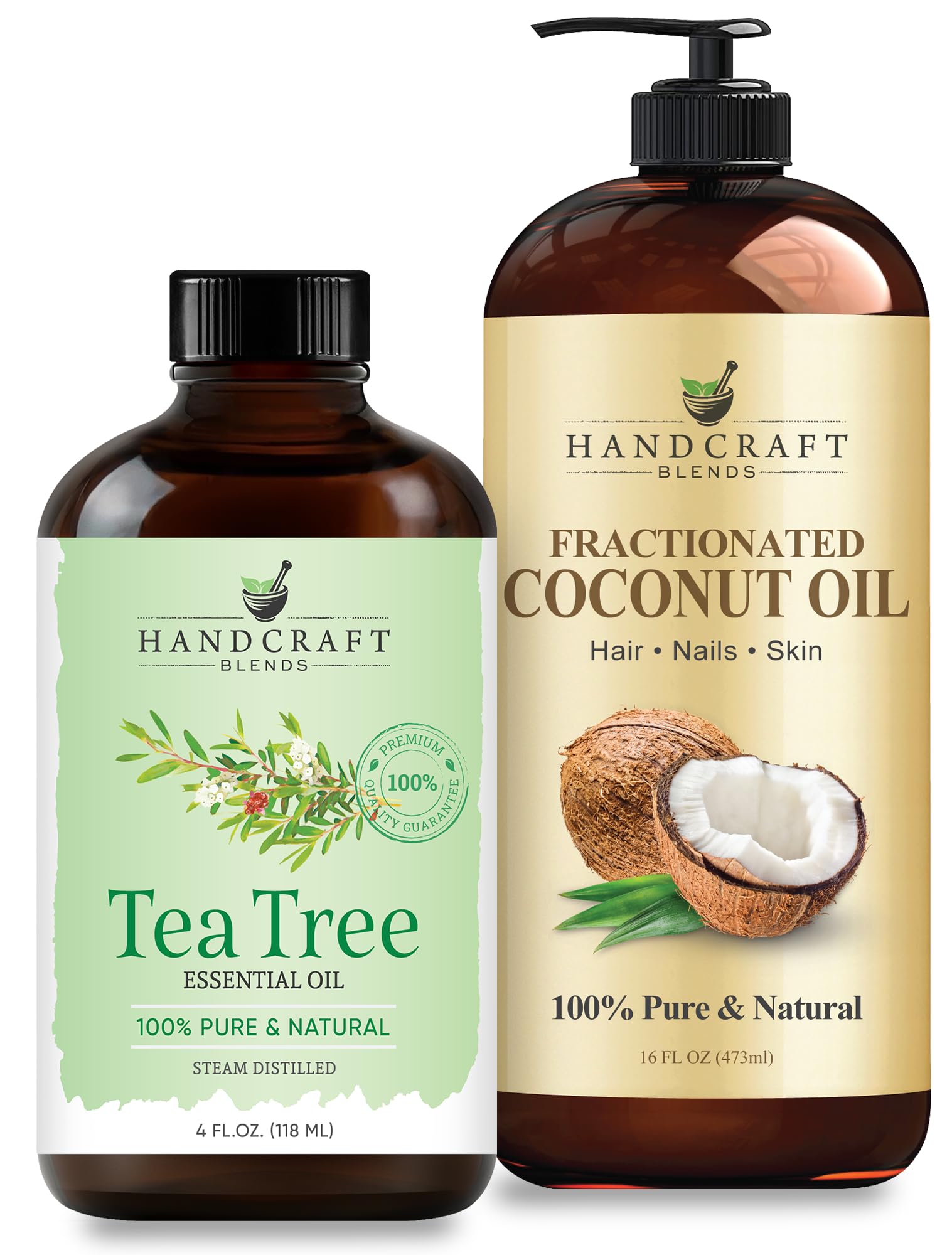 Handcraft Blends Purifying Body Set: Fractionated Coconut Oil (16 Fl Oz) and Tea Tree Essential Oil (4 Fl Oz) 100% Pure & Natural for Clean Skin Feet and Scalp