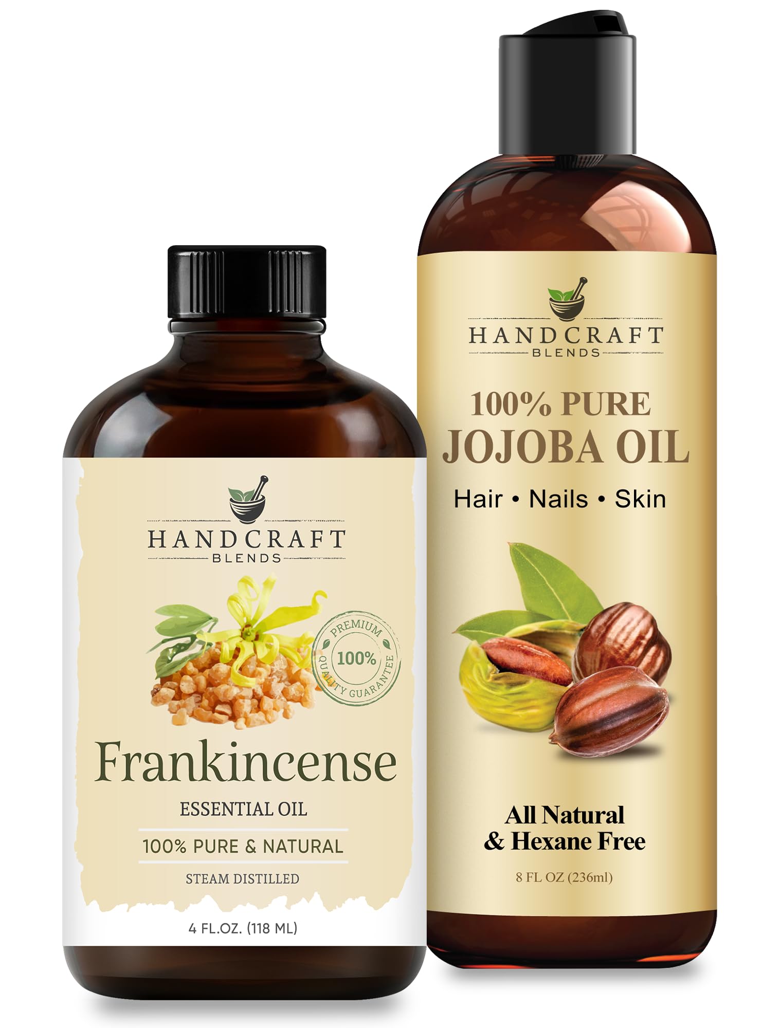 BOTTLED IN THE USA QUALITY GUARANTEED: We source our oils from the finest regions around the world and bottle them with care in the United States. Your satisfaction is guaranteed. DAILY FACIAL SERUM: Mix a few drops of Frankincense into Jojoba oil for a premium, chemical-free night serum or daily moisturizer. 100 PURE FRANKINCENSE ESSENTIAL OIL (4oz): The "King of Oils" for skin. Famous for its ability to beautify and rejuvenate the skin, helping to smooth out imperfections. 100 PURE ORGANIC JOJOBA OIL (8oz): A liquid wax ester that deeply penetrates the skin. It helps lock in moisture and improves skin elasticity without leaving a greasy residue. THE ULTIMATE ANTI-AGING DUO: Rejuvenate and hydrate. Jojoba Oil delivers deep moisture, while Frankincense helps tone and tighten the skin's appearance for a smoother, younger look.