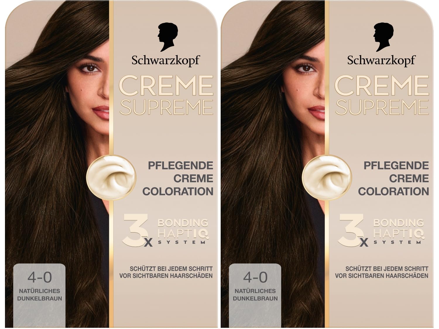 Schwarzkopf Creme Supreme Caring coloring, with 3 x Bonding HaptIQ system The formula of the permanent coloring with 3x Bonding HaptIQ system protects against visible hair damage before, during and after coloring and ensures intensive and even color results with 100 coverage. 1st The intensively nourishing Bonding Pre-serum with Schwarzkopf Bonding HaptIQ system optimally prepares the hair for the coloring process. It forms new micro bonds and smoothes damaged hair at the same time. For strengthened hair and evenly beautiful color results.2. Bonding Coloration protects the hair against new damage during dyeing. For a radiant hair color.3. Finally, the Bonding hair mask covers the hair with a protective layer and forms new micro bonds and ensures intensively cared for hair. Product benefits in detail: Protects against visible hair damage. 3 x Bonding HaptIQ system. For intensive and even color results. 100 gray coverage. Our tip: choose the lighter shade of a Schwarzkopf hair color if you have to choose between two colors. The color result depends on your original hair color.Our tip: choose the lighter shade of a Schwarzkopf hair color if you have to choose between two colors. The color result depends on your original hair color. 3rd Bonding hair mask: for the final care, the hair mask envelops the hair with a protective layer and forms new micro bonds and ensures intensively cared for hair. 2nd Bonding Coloration: with the Bonding Coloration, the hair is protected against new damage during dyeing, for a radiant hair color and 100 gray coverage. 1st Bonding Pre-serum: Thanks to its nourishing and smoothing effect, the intensively nourishing pre-serum also optimally prepares damaged hair for the coloring process. Caring cream coloring: the formula of the permanent coloring with 3x Bonding HaptIQ system protects against visible hair damage and ensures intensive and even color results.Coloration 4-0 Natuurlijk donkerbruin (2 x 182 ml), duurzame haarverf met serum en haarmasker beschermt tegen zichtbare haarschade, voor 100 grijsdekking Schwarzkopf Creme Supreme Verzorgende kleuring, met 3 x Bonding HaptIQ-systeem De formule van de permanente kleuring met 3x Bonding HaptIQ-systeem beschermt voor, tijdens en na de kleuring tegen zichtbare haarschade en zorgt voor intensieve en gelijkmatige kleurresultaten met 100 grafdekking. 1ste Het intensief voedende Bonding Pre-serum met Schwarzkopf Bonding HaptIQ-systeem bereidt het haar optimaal voor op het kleuringsproces. Het vormt nieuwe microverbindingen en maakt tegelijkertijd beschadigd haar glad. Voor versterkt haar en gelijkmatig mooie kleurresultaten.2. Bonding Coloration beschermt het haar tijdens het verven tegen nieuwe schade. Voor een stralende haarkleur.3. Tot slot omhult het Bonding haarmasker het haar met een beschermlaag en vormt nieuwe microverbindingen en zorgt voor intensief verzorgd haar. Productvoordelen in detail: Beschermt tegen zichtbare haarschade. 3 x Bonding HaptIQ-systeem. Voor intensieve en gelijkmatige kleurresultaten. 100 grijsdekking. Onze tip: kies de lichtere kleurnuance van een Schwarzkopf haarkleur als je moet kiezen tussen twee kleuren. Het kleurresultaat is afhankelijk van je oorspronkelijke haarkleur.Onze tip: kies de lichtere kleurnuance van een Schwarzkopf haarkleur als je tussen twee kleuren moet kiezen. Het kleurresultaat hangt af van je oorspronkelijke haarkleur. 3de Bonding haarmasker: voor de laatste verzorging omhult het haarmasker het haar met een beschermlaag en vormt nieuwe microverbindingen en zorgt voor intensief verzorgd haar. 2de Bonding Coloration: met de Bonding Coloration wordt het haar tijdens het verven beschermd tegen nieuwe schade, voor een stralende haarkleur en 100 grijsdekking. 1ste Bonding Pre-serum: het intensief voedende pre-serum bereidt dankzij zijn verzorgende en gladmakende werking ook beschadigd haar optimaal voor het kleuringsproces. Verzorgende crèmekleuring: de formule van de permanente kleuring met 3x Bonding HaptIQ-systeem beschermt tegen zichtbare haarschade en zorgt voor intensieve en gelijkmatige kleurresultaten.