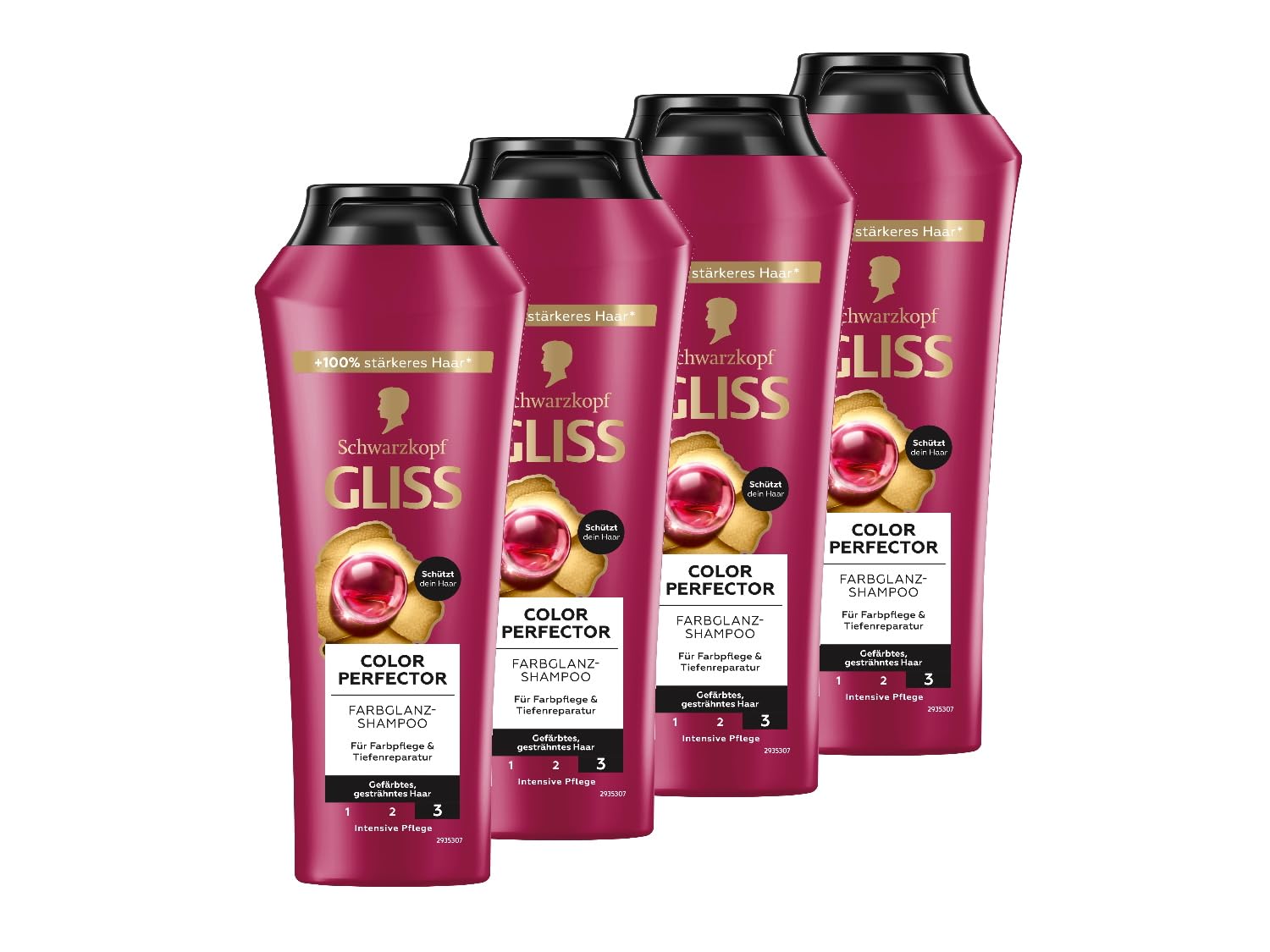 Gliss Colour Perfector Shampoo – Repair Shampoo for colored, colour-treated, and styled hair. Do you feel like your hair is wearing down and washes out quickly with frequent washing? Then your hair needs intensive repair and special protection for vibrant colour and shine, as well as 100 stronger hair. Gliss shampoo provides deep repair, offers colour protection for up to 13 weeks, and long-lasting colour shine. Thanks to a hyaluronic acid complex and cranberry extract, it repairs the internal hair structure while simultaneously protecting the colour. The result: long-lasting colour protection¹ and radiant shine. A combination of high-quality active ingredients and natural essences forms the basis of all Gliss formulas. These are tailored to the specific needs of your hair and provide repair and visibly improved hair quality. The bottle is made from 80 recycled materials¹, and the shampoo is made from 87 ingredients of natural origin². The hair care is PETA certified³. Product benefits in detail: Care shampoo for colored, coloured and styled hair Repairs the internal hair structure Provides up to 13 weeks of colour protection for 100 stronger hair. With hyaluronic acid complex cranberry extract. Directions for use: Gently distribute through damp hair and rinse thoroughly. Use regularly for hair care and for optimal results follow with the Colour Perfector conditioner. Includes closure, label and dye. ² incl. water³ Global Animal Test Policy. INSTRUCTIONS FOR USE: Gently distribute through damp hair. Rinse thoroughly. Use regularly.Easy to use: gently distribute into damp hair and rinse thoroughly. Use regularly for hair care and then use the Color Perfector conditioner for optimal results. Good for the planet: the women's shampoo bottle consists of 80 recycled material¹, 87 of the ingredients are of natural origin² and is PETA certified. Color Perfector – the Gliss shampoo is tailored to the needs of colored and colored hair, for deep repair and up to 13 weeks of color protection. With hyaluron complex and cranberry extract: thanks to hyaluron complex and cranberry extract, the Gliss Color Perfector shampoo deeply restores the internal structure of the hair. Intensive color protection: the shampoo for colored hair protects and strengthens the hair for a visibly restored and healthy shiny result.Gliss Colour Perfector Shampoo (4 x 250 ml), haarshampoo met hyaluroncomplex en cranberry-extract, kleurshampoo voor gekleurd, highlights en gekleurd haar 250 ml (4er Pack) Gliss Colour Perfector Shampoo – Repair Shampoo voor gekleurd, gekleurd en gestyled haar. Heb je het gevoel, haarkleuren belasten het haar en de kleur wast snel uit door veelvuldig wassen? Dan heeft je haar intensieve reparatie en speciale bescherming nodig voor intensieve kleur en helderheid, evenals voor 100 sterker haar. De Gliss shampoo zorgt voor een diepe reparatie, biedt kleurbescherming tot 13 weken en langdurige kleurglans. Dankzij hyaluroncomplex en cranberry-extract herstelt het de interne haarstructuur en beschermt het tegelijkertijd de kleur. Het resultaat: langdurige kleurbescherming¹ en stralende glans. Een combinatie van hoogwaardige haaractieve stoffen en essences van de natuur is de basis van alle Gliss-formules. Ze zijn afgestemd op de speciale behoeften van het haar en zorgen voor reparatie en een zichtbaar verbeterde haarkwaliteit. De fles bestaat uit 80 gerecycled materiaal¹ en de shampoo voor 87 uit ingrediënten van natuurlijke oorsprong². De haarverzorging is PETA gecertificeerd³.De productvoordelen in detail: verzorgingsshampoo voor gekleurd, gekleurd en gestyled haar Repareert de interne haarstructuur Geeft tot 13 weken kleurbescherming voor 100 sterker haar Met hyaluroncomplex cranberry-extract Toepassing: zacht in vochtig haar verdelen en goed uitspoelen. Regelmatig voor haarverzorging gebruiken en voor optimale resultaten vervolgens de Colour Perfector conditioner gebruiken. Inclusief sluiting, etiket en kleurstof. ² incl. water³ Global Animal Test Policy GEBRUIKSAANWIJZING Zacht in vochtig haar verdelen. Goed uitspoelen. Regelmatig gebruiken.Eenvoudig in gebruik: voorzichtig in vochtig haar verdelen en goed uitspoelen. Regelmatig voor haarverzorging gebruiken en voor optimale resultaten vervolgens de Colour Perfector conditioner gebruiken. Goed voor de planeet: de fles van de damesshampoo bestaat uit 80 gerecycled materiaal¹, 87 van de ingrediënten zijn van natuurlijke oorsprong² en is PETA gecertificeerd. Colour Perfector – de Gliss shampoo is afgestemd op de behoeften van gekleurd en gekleurd haar, voor dieptereparatie en tot 13 weken kleurbescherming. Met hyaluroncomplex en cranberry-extract: dankzij hyaluroncomplex en cranberry-extract herstelt de Gliss Colour Perfector shampoo de interne structuur van het haar diepgaand. Intensieve kleurbescherming: de shampoo voor gekleurd haar beschermt en versterkt het haar voor een zichtbaar hersteld en gezond glanzend resultaat.