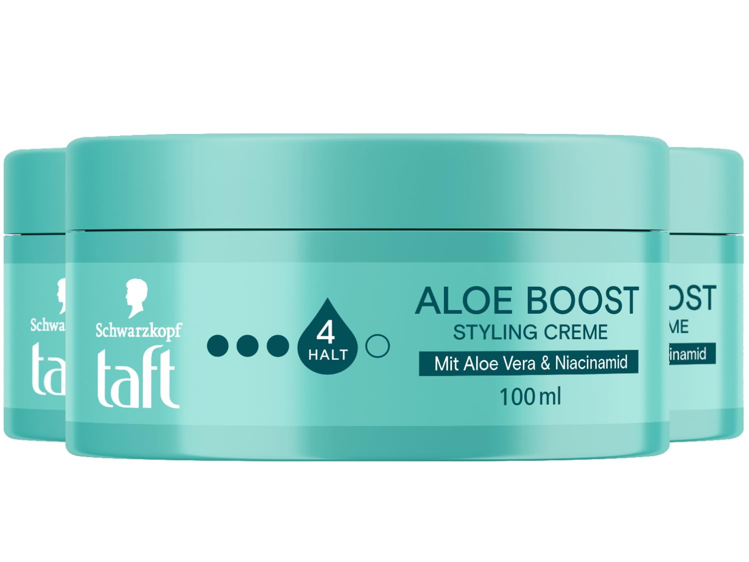 TAFT Styling cream, aloe boost with aloe vera complex and niacinamide, light formula with holding level 4 The TAFT Aloe Boost styling cream with strength level 4 gives the hair natural looks and long-lasting hold. Thanks to the light formula and supple texture, it does not weigh the hair down and provides a soft hair feeling. With aloe vera complex it moisturizes while niacinamide strengthens the hair - for well-groomed and healthy-looking hair. The hair care formula also helps to protect the hairstyle from humidity. TAFT Styling products use vegan formulas, are free of animal-derived ingredients and PETA approved. Product benefits in detail: Soft and caring. Confirmation grade 4. Smooth texture and light formula. With moisturizing aloe vera complex. With niacinamide for strengthened hair. Helps protect the hairstyle against humidity. Vegan formula Use: rub the cream between the palms and apply to dry or damp hair. Free from ingredients of animal origin, PETA approved according to Global Animal Test Policy. INSTRUCTIONS FOR USE Rub the cream between the palms of your hands and apply to dry or damp hair.Vegan Formula: The formula of the styling cream is vegan and free from ingredients of animal origin and PETA approved. Smooth finish: Thanks to its smooth texture, the styling cream gives a particularly natural-looking hair styling. With aloe vera and niacinamide – the aloe vera complex in Schwarzkopf hair wax provides the hair with moisture, niacinamide ensures strengthened hair. Long hold without weighing down: with a holding level of 4, the TAFT hair wax provides a long hold without weighing down and helps protect the hairstyle against humidity. TAFT Aloe boost: the light aloe boost styling cream gives your styling a smooth finish, nourishes the hair and creates natural, long-lasting looks.TAFT Styling Crème Aloë Boost, houdgraad 4 (3 x 100 ml), zachte en voedende haarwax met aloë vera-complex en niacinamide, styling wax voor natuurlijke looks en langdurige grip TAFT Stylingcrème, aloë boost met aloë vera-complex en niacinamide, lichte formule met houdgraad 4 De TAFT Aloë Boost stylingcrème met houdgraad 4 geeft het haar natuurlijke looks en langdurige grip. Dankzij de lichte formule en soepele textuur verzwaart het het haar niet en zorgt het voor een zacht haargevoel. Met aloë vera-complex hydrateert het terwijl niacinamide het haar versterkt – voor verzorgd en gezond uitziend haar. De haarverzorgingsformule helpt ook om het kapsel tegen luchtvochtigheid te beschermen. TAFT Styling-producten gebruiken veganistische formules, zijn vrij van ingrediënten van dierlijke oorsprong en PETA goedgekeurd. Productvoordelen in detail: Zacht en verzorgend. Bevestigingsgraad 4. Soepele textuur en lichte formule. Met vochtinbrengend aloë vera-complex. Met niacinamide voor versterkt haar. Helpt het kapsel tegen luchtvochtigheid te beschermen. Veganistische formule Gebruik: wrijf de crème tussen de handpalmen en breng aan op droog of vochtig haar. Vrij van ingrediënten van dierlijke oorsprong, PETA goedgekeurd volgens Global Animal Test Policy. GEBRUIKSAANWIJZING Wrijf de crème tussen de handpalmen en breng aan op droog of vochtig haar.Veganistische formule: de formule van de stylingcrème is veganistisch en vrij van ingrediënten van dierlijke oorsprong en PETA goedgekeurd. Soepele afwerking: dankzij zijn soepele textuur geeft de stylingcrème een bijzonder natuurlijk uitziende haarstyling. Met aloë vera en niacinamide – het aloë vera-complex in Schwarzkopf haarwax verzorgt het haar met vocht, niacinamide zorgt voor versterkt haar. Lange grip zonder verzwaren: met houdgraad 4 zorgt de TAFT haarwax voor een lange grip, zonder te verzwaren en helpt het kapsel tegen luchtvochtigheid te beschermen. TAFT Aloë boost: de lichte aloë boost stylingcrème geeft je styling een soepele afwerking, verzorgt het haar en tovert natuurlijke, langdurige looks.