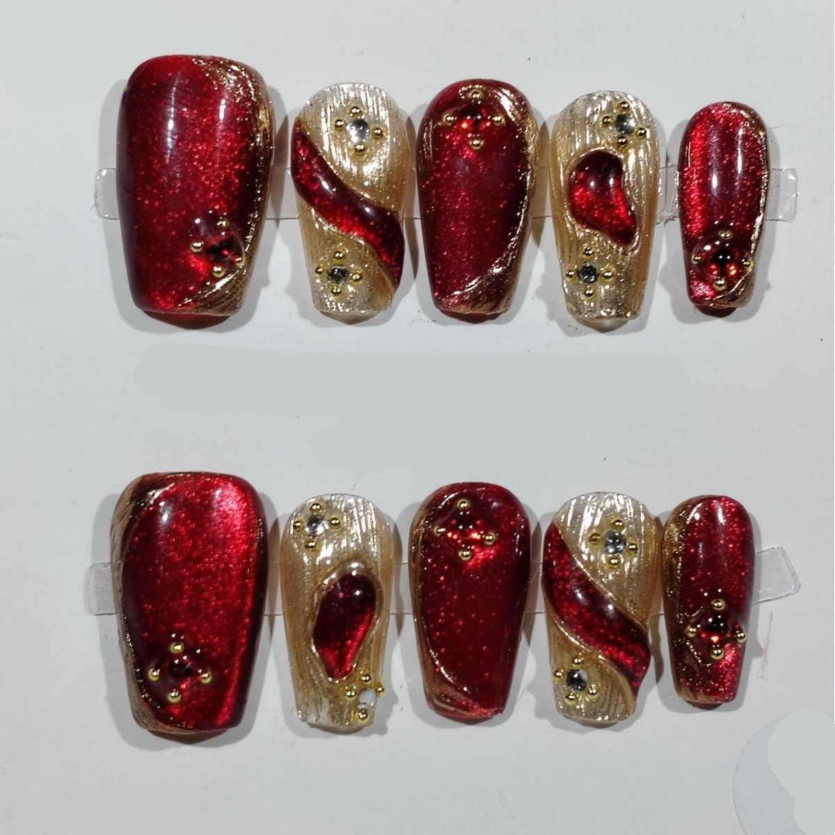 Enhance your nail art game with these Handmade Nail Art New Red Cat Eye Nails. These stunning nails feature a red cat eye design that will make your nails stand out at any occasion. Whether you're getting ready for a New Year's party or just want to add a touch of glamour to your everyday look, these long fake nails are the perfect choice. Made with high-quality materials, these nails are reusable and can be easily applied and removed. The full cover design ensures a natural appearance, while the sparkling glitter adds a touch of elegance. Upgrade your nail game with these Handmade Nail Art New Red Cat Eye Nails.Handmade with care for exquisite nail art, Stunning red cat eye design for a glamorous look, Perfect for New Year celebrations, Long-lasting and reusable nails, Full cover design for a natural appearance, Sparkling glitter adds a touch of elegance.