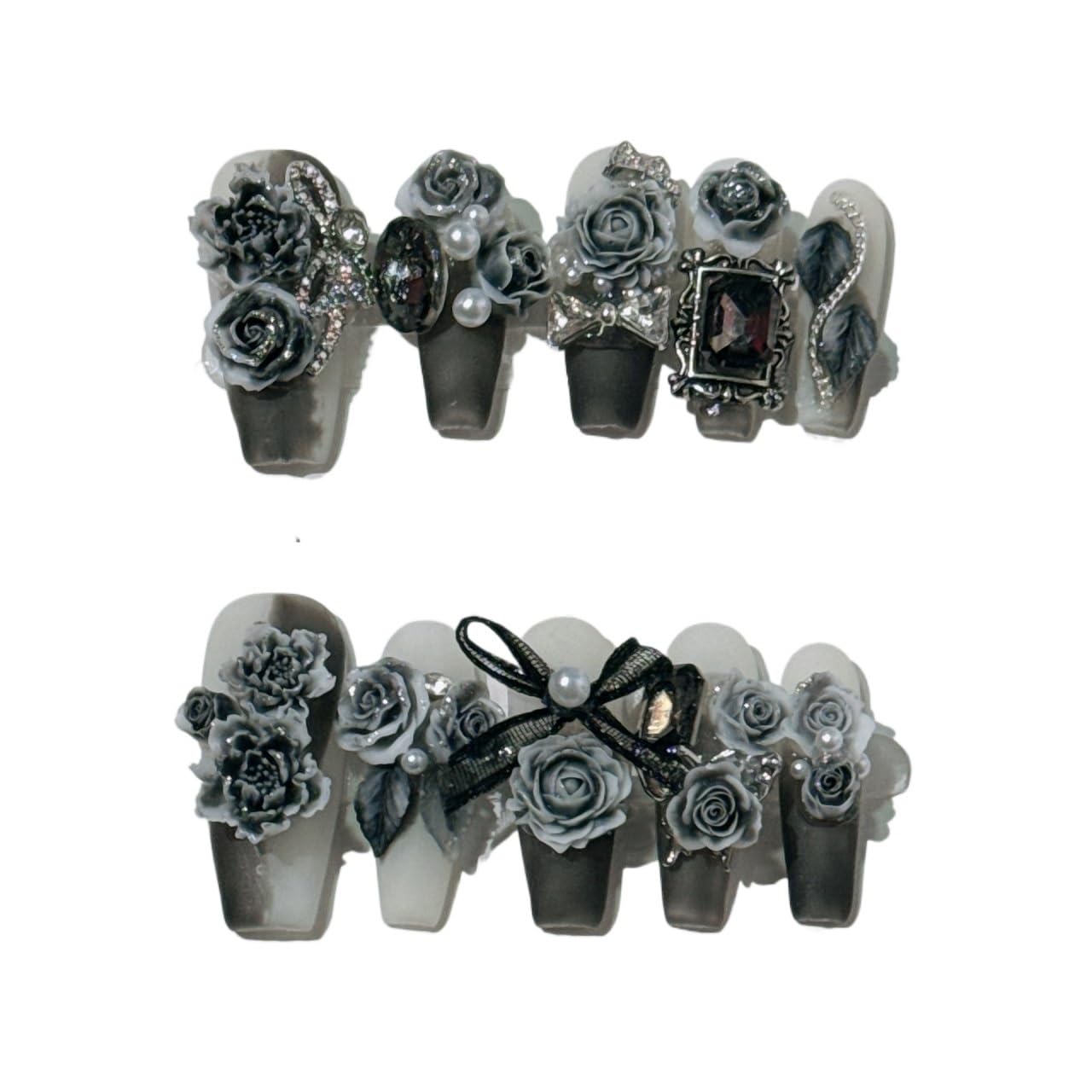 Handmade Nail Wearing and Nail Sculpture with Black Rose Ink Nail Fake Nails(Size:M)