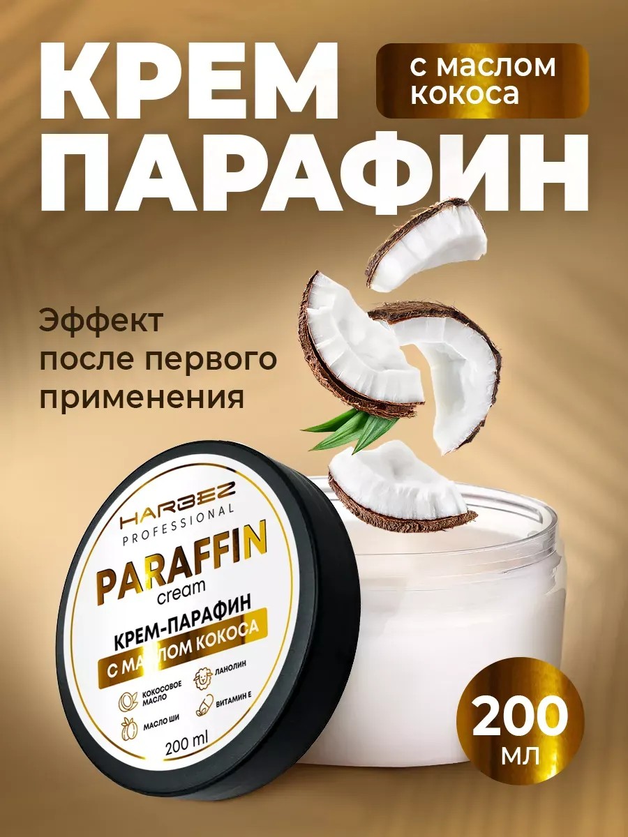 Крем-парафин кокосовый Harbez увлажняющий питательный смягчающий с комплексом натуральных масел для обветренной, очень сухой, чувствительной и комбинированной кожи от трещин и сухости. Для spa процедуры профессиональной парафинотерапии. Плотная жирная текстура крема-парафина тает при нанесении, создавая эффект прогрева. Холодный парафин для рук восстанавливает баланс влаги, стимулирует выработку коллагена, повышает эластичность, разглаживает. Ночной, дневной массаж, восстановление. Омолаживающий крем баттер женский, мужской, для беременных эффективно защищает от обветривания, устраняет шелушение и стянутость. Косметическое средство оказывает укрепляющее действие на ногти, снижает ломкость, смягчает кутикулу. Регенерирующий заживляющий защитный крем-воск органик от раздражения для ступней ног, стоп, локтей, пяток. Разогрейте в ладонях небольшое количество воска и нанесите на проблемные зоны. Оберните полиэтиленовой пленкой, укройте полотенцем. Обертывание (парафиновая ванна) длится 15 минут. Антивозрастной восстанавливающий hand cream для рук будет прогревать и питать Вашу кожу. Косметика уходовая для защиты, смягчения и заживления. Маска против трещин, уход за телом женщины без силиконов, минеральных масел, парабенов и синтетических красителей.