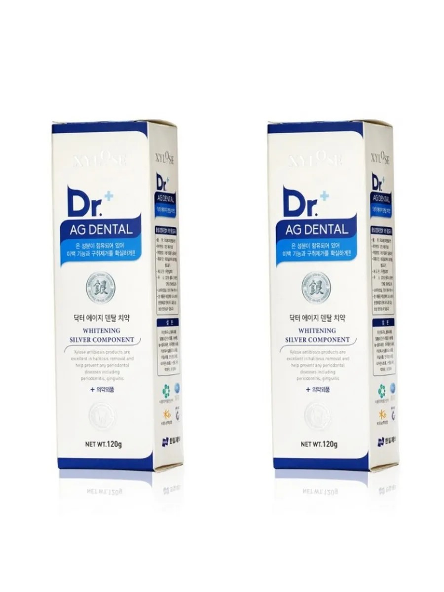 Hanil XYLOSE Dr.+ AG DENTAL Whitening Silver Component Whitening Toothpaste, 120 g, 2 pcs. This Korean toothpaste effectively cares for teeth, gums, and fresh breath. It helps combat plaque, bad breath, and coffee stains, gently whitens, and gives your smile a Hollywood glow. Its gentle formula restores enamel integrity, prevents bacterial growth, and prevents the development of oral diseases. Silver inclusions prevent sensitivity, bleeding, enamel weakness, and bacterial growth. Chitosan prevents enamel erosion, strengthens weak gums, and helps prevent periodontitis and gingivitis during the fall and spring periods of vitamin deficiency. Allantoin promotes the regeneration of damaged mucous membranes, eliminates bleeding, and has an antibacterial effect.