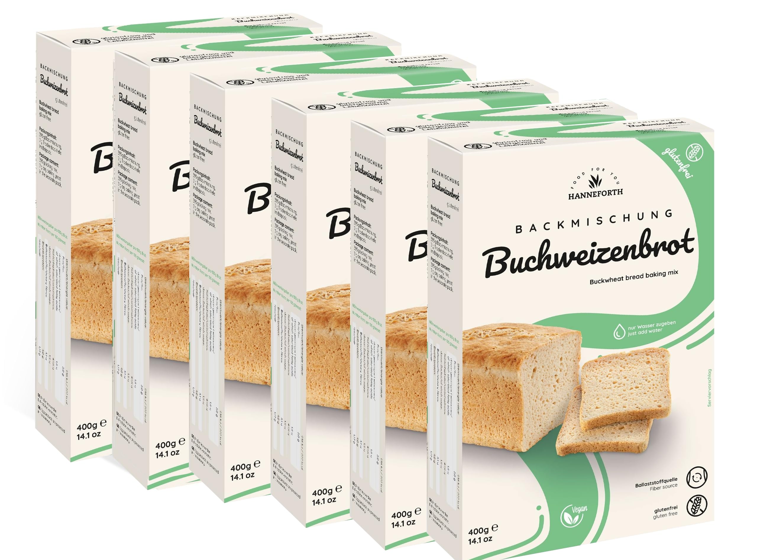 : Who doesn't love the smell of freshly baked bread? With our popular baking mix you can easily bake gluten-free bread yourself. By refraining from many known allergens and additives, our baking mixtures are well tolerated by many people. Whether it's bread, baguettes or rolls, what are you going to bake next? Baking in bread maker. You can also bake our baking mixtures in the bread maker. Select a 1 - max. 2-hour program, because the dough is only kneaded briefly and is not allowed to rise for too long. Because the machine usually cannot develop strong heat at the top, your bread may not get a closed crust. That is why we recommend baking in a baking tin. This way you also achieve the best bread aroma. yeast-free baking To prepare the bread nicely, we will send you a pack of dry yeast. If you cannot tolerate yeast, you can also replace it with baking powder. We recommend approximately 1 tbsp, it is best to try this out a little. You no longer have to let the dough go, but bake it directly in the oven. Hanneforth FOOD FOR YOU Hanneforth stands for honest and gluten-free baking products with lots of taste. Our products are made without corn, without guar kernel flour, without wheat starch, without coloring agents and without flavor enhancers. INGREDIENTS rice flour, buckwheat flour (15 ), potato starch, cooking banana flour, tef flour, dextrose, fat powder (unhydrogenated palm fat, RSPO certified), dry baking yeast (package), salt, thickener: HPMC, acidulant: citric acid INSTRUCTIONS FOR USE Dissolve dry yeast completely in lukewarm water. Place baking mixture with dissolved yeast in a bowl. Mix everything together for 3-4 minutes and grease the baking tin (ideally about 20 cm long). Then fill the dough into the baking tin, smooth it out and moisten it slightly. Let the dough rest until it has risen about 2-3 cm. Bake for 1 hour in the preheated oven (oven approx. 210 convection: 200 ) See moreHanneforth Glutenvrij bakmengsel boekweitbrood 6 x 400 g : Wie houdt er niet van de geur van vers gebakken brood? Met onze populaire bakmix kun je heel eenvoudig glutenvrij brood zelf bakken. Door af te zien van veel bekende allergenen en additieven, worden onze bakmengsels door veel mensen goed verdragen. Of het nu om brood, stokbrood of broodjes gaat, wat ga je daarna bakken? Bakken in broodbakmachine. Je kunt onze bakmengsels ook in de broodbakmachine bakken. Selecteer hiervoor een 1 – max. 2-uurs programma, omdat het deeg slechts kort gekneed wordt en niet te lang mag rijzen. Omdat de machine meestal geen sterke hitte aan de bovenkant kan ontwikkelen, krijgt je brood eventueel geen gesloten korst. Daarom raden wij het bakken in een bakvorm aan. Zo bereik je ook het beste broodaroma. gistvrij bakken Om het brood mooi op te gaan, sturen wij je een pakje droge gist mee. Als je geen gist verdraagt, kun je deze ook vervangen door bakpoeder. Wij raden ongeveer 1 el aan, probeer dit het beste een beetje uit. Je hoeft het deeg dan niet meer te laten gaan, maar direct in de oven bakken. Hanneforth FOOD VOOR YOU Hanneforth staat voor eerlijke en glutenvrije bakproducten met veel smaak. Onze producten worden gemaakt zonder maïs, zonder guarkernmeel, zonder tarwezetmeel, zonder kleurstoffen en zonder smaakversterkers. INGREDIËNTEN rijstmeel, boekweitmeel (15 ), aardappelzetmeel, kookbananenmeel, tefmeel, dextrose, vetpoeder (ongehard palmvet, RSPO-gecertificeerd), droge bakgist (bijpak), zout, verdikkingsmiddel: HPMC, zuurmiddel: citroenzuur GEBRUIKSAANWIJZING Oplossen van droge gist volledig in lauw water. Bakmengsel met opgeloste gist in een kom doen. Alles 3-4 minuten met elkaar mengen en de bakvorm (idealiter ongeveer 20 cm lang) invetten. Vervolgens het deeg in de bakvorm vullen, glad strijken en licht bevochtigen. Laat het deeg rusten tot het ongeveer 2-3 cm is opgegaan. 1 uur in de voorverwarmde oven bakken (bakoven ca. 210 convectie: 200 ) Meer bekijken
