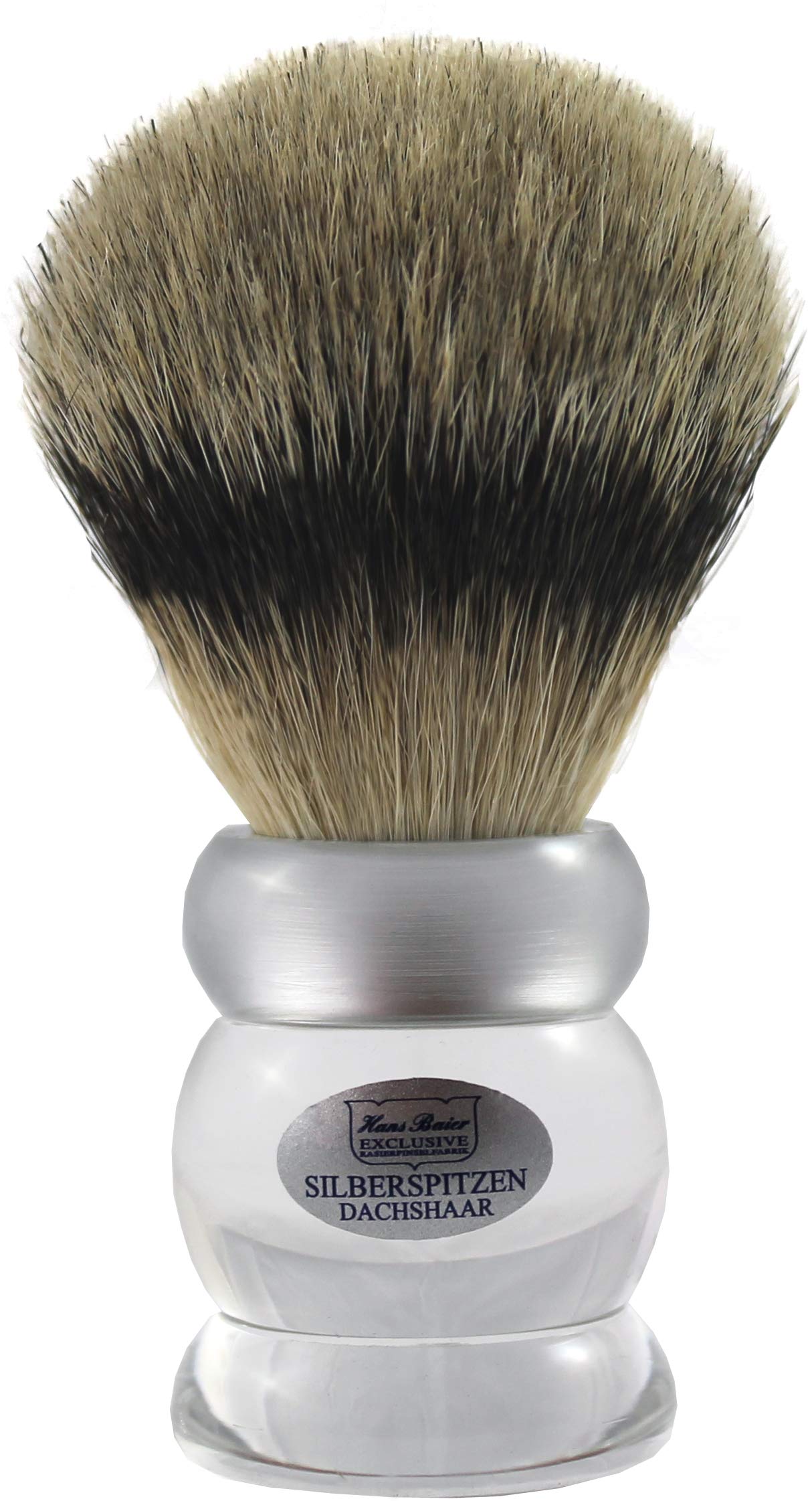 Hans Baier Exclusive has stood for the high quality of shaving brushes made in Germany for almost 100 years.Razor brush made of real Silberspitz-Tachshaar hand-bound.The hair comes from the neck area of ??the roof.The finest hair ensures stable and voluminous foam when using a shaving soap.With this shaving brush, you work intensively into the beard in a circular movements and the foam puts itself around the whiskers.Real Silberspitz-Tachshaar Hand-bound (no imitation) size 3 (Ø floor = 25, 5mm).Grip acrylic with silver strips.Care instructions: After use, wash the brush thoroughly under warm, flowing water to remove the remaining soap from the hair.Refuse the rough wet.Keep the shaving brush hanging or at least lying so that the residual moisture cannot damage the hair and the handle.We recommend storing in one of the Hans Baier shaving stands.