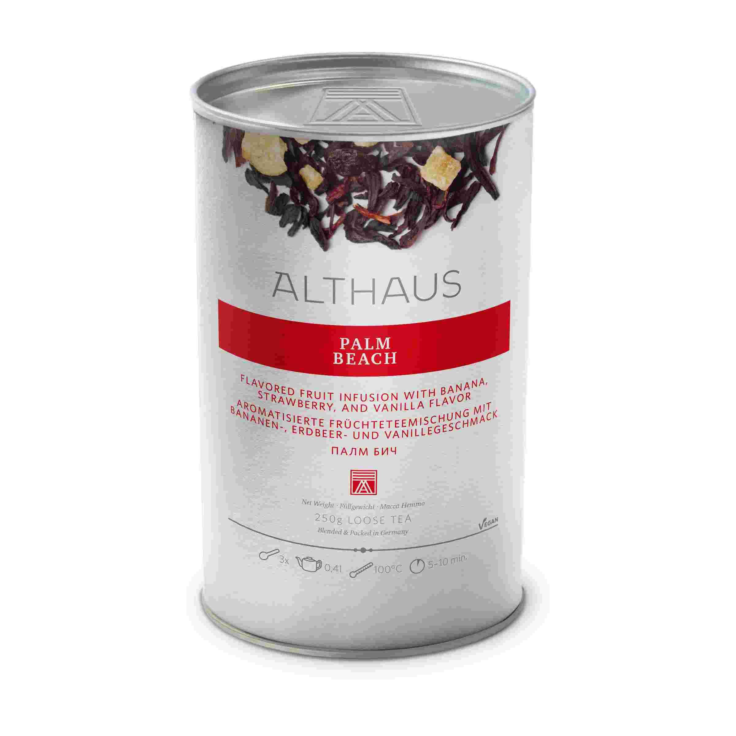 The taste of Palm Beach makes you dream of tropical beaches. Vanilla and banana flavors are combined with a subtle strawberry note in this powerful fruit tea blend. INGREDIENTS Palm Beach (aromatic fruit tea): pineapple pieces, hibiscus flowers, wine berries, cherries, banana chips, strawberry flavor, banana flavor and vanilla flavorAlthaus Palm Beach 250 g De smaak van Palm Beach laat je dromen van tropische stranden. Vanille- en bananensmaak is in deze krachtige vruchtentheemengsel gecombineerd met een subtiele aardbeinoot. INGREDIËNTEN Palm Beach (aromatische vruchtenthee): stukjes ananas, hibiscusbloemen, wijnbessen, kersen, bananenchips, aardbeiensmaak, bananenaroma en vanillearoma