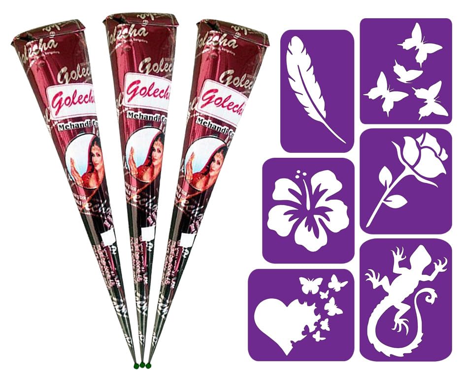 The Kit of 3 PCs X Natural Henna Cions Red-Brown Color Golecha Henna Cones 3 PCs X 30 G 6 PCs Three-Layer Stencils Was Preed by our Team With The Though Of All Meendii and Fake Freckles fans.Please note: Allegric test is request as a minimum of 24-72 hours before Active using.All our henna passed via Full EU Certification Process, including dermatological and microbiological tests.The Products Are Suitable for Age Category 3 .Please remember that this child of henna belong to category of non -immediate effect.The Final Color (Red-Brown or Dark Brown) wants Appear Within 24-48 Hours After Application.The intnesiability of final color is fully depending of Body area and from how long the henna paste was holded on the body well.As Longer it Gets Dry, as Stronger The Final Color will be.the real advantage of this henna is the presence of literally microscopic amount of parabens in IT, Summary 0.40 this component plays very important role by protecting the contents of the henna from any pathogenic bacteria, what is specific for natural product.This Amount Considered as Absolute Ely Safe for Health.Ingredient: Aqua, Lawsonia Inermis Extract, Cyamopsis Tetragonolobus Gum, Eucalyptus Globulus Leaf Oil, Phenonip 0.40 (phenoxyathanol, methyl paraben, ethyl paraben, butyl paraben).Attention: Allergic test is request 24-72 h before Active Using.Instruction for use: Clean up the Skin Area Before Start Applying Henna.Remove Plastic Protector from the Cone, Apply Henna on the Skin, Last for As Minimum 1.5-2h Until Henna Become Fully Dry.Carefully Remove Dry Henna.Attention: This Henna Belong to Category of Non-Fast Effect.The Final Result wants Appear Within 48-72 H After Applying.The Color Will Become Brown or Dark Brown Depending of a Body Area.May Stay Even Till 14 Days.No PPD, no Harmful Chemicals, Certied in EU.Category of Users: 3 The Color: Natural Red-Brown.Ready Tattoo Lasts for 7-12 Days, Depending of Body Area.In the case of making fake freckles-up to 3 days.Henna Kit: 3 x 30g Golecha Natural Henna Cones 6 Three-Layer Stencils (Color of Henna: Natural Red-Brown).The Kit of 3 pcs x natural henna cones red-brown colour GOLECHA Henna Cones 3 pcs x 30 g 6 pcs three-layer stencils was preed by our team with the thought of all Mehendi and Fake freckles fans. Please note: Allegric test is required as a minimum of 24-72 hours before active using. All our henna passed via full EU Certification Process, including dermatological and microbiological tests. The products are suitable for Age Category 3 . Please remember that this kind of henna belong to category of non-immediate effect. The final colour (Red-Brown or Dark Brown) will appear within 24-48 hours after application. The intnesivity of final colour is fully depend of body area and from how long the henna paste was holded on the body while getting dry. As longer it gets dry, as stronger the final colour will be.The real advantage of this henna is the presence of literally microscopic amount of parabens in it, summary 0.40 This component plays very important role by protecting the contents of the henna from any pathogenic bacteria, what is specially important for natural products. This amount considered as absolute ely safe for health. Ingredients: Aqua, Lawsonia Inermis Extract, Cyamopsis Tetragonolobus Gum, Eucalyptus Globulus Leaf Oil, Phenonip 0,40 ( Phenoxyathanol, Methylparaben, Ethylparaben, Propylparaben, Butylparaben). Attention: Allergic test is required 24-72 h before active using . Instruction for use: clean up the skin area before start applying henna. Remove plastic protector from the cone, apply henna on the skin, last for as minimum 1,5-2h until henna become fully dry. Carefully remove dry henna. ATTENTION: This henna belong to category of non-fast effect. The final result will appear within 48-72 h after applying. The colour will become Brown or Dark Brown depending of a body area. May stay even till 14 days. No PPD, No harmful chemicals, Certifed in EU. Category of users: 3 The colour: Natural Red-Brown. Ready Tattoo Lasts for 7-12 days , depending of body area. In the case of making fake freckles- up to 3 days . Henna Kit: 3 x 30g Golecha Natural Henna cones 6 three-layer stencils ( Colour of henna: natural Red-Brown ).HANUMAN STORE 3x 30g Golecha 100 Natural Red-Brown Henna Mehendi Cone x 6 stencils, No Chemicals, No PPD
